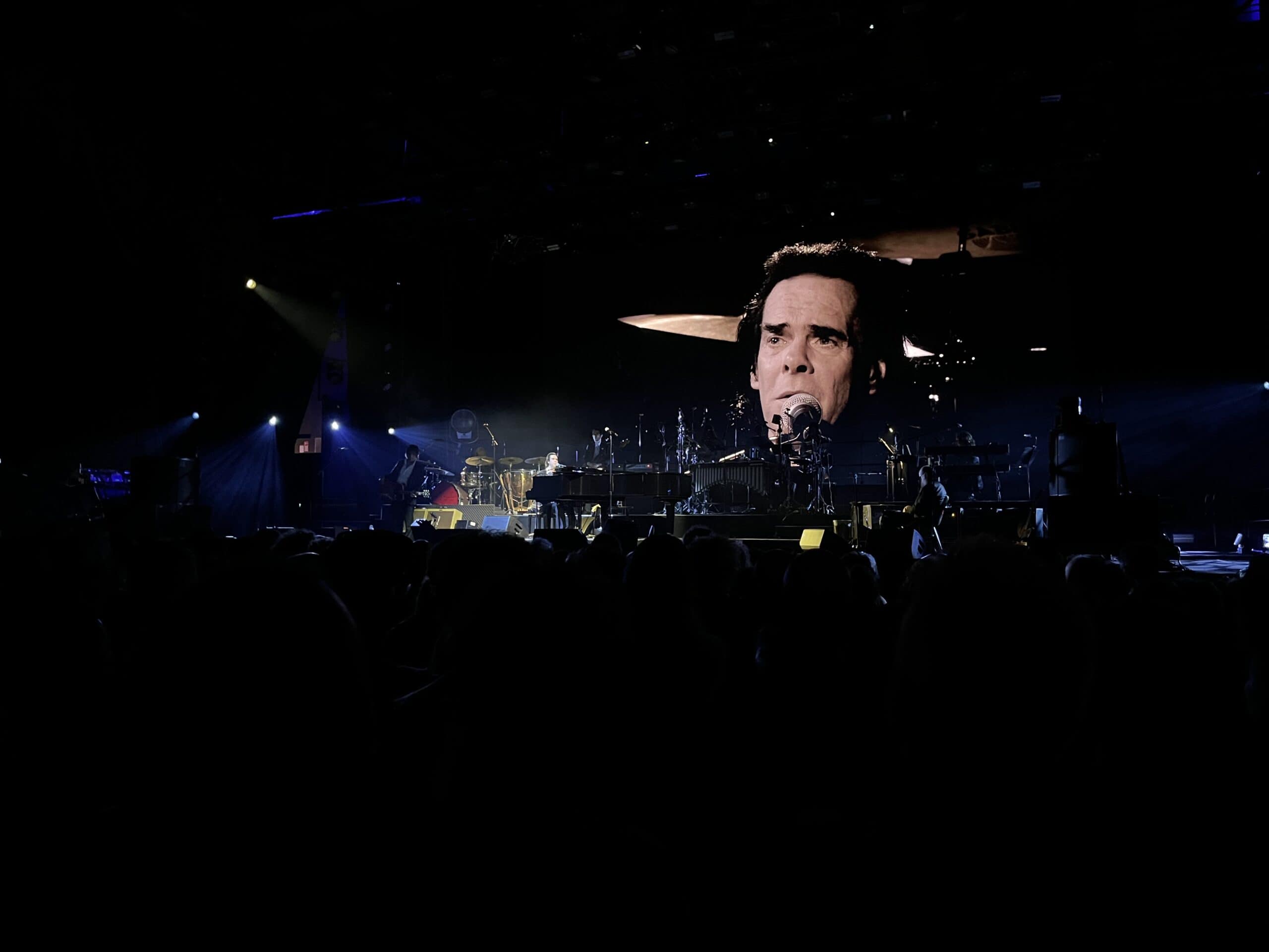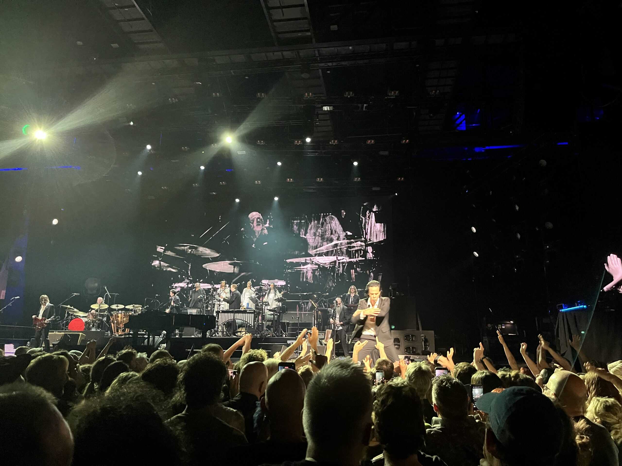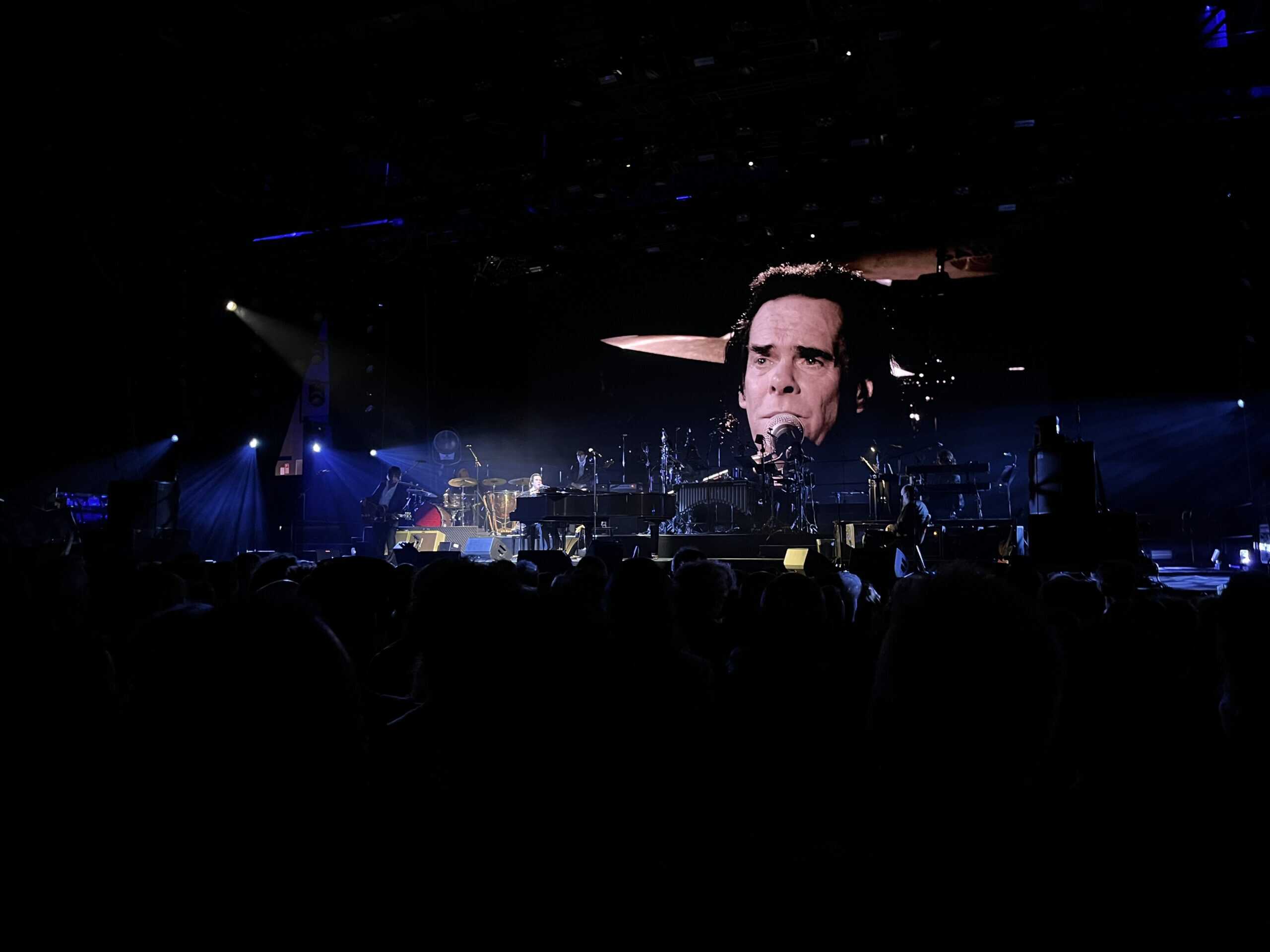 Musically, the set moved in waves. Cave returned to the piano again and again, and some of the evening’s most affecting passages came there. Jubilee Street gathered slowly into something vast. Cinnamon Horses held the arena in a fragile stillness as synths rose behind him. The familiar swing of Red Right Hand brought the room into singalong, while The Mercy Seat expanded from piano rumble into thunder. Other moments hinted at the band’s depth: layered harmonies and rhythmic shifts that made each transition feel purposeful, each arrival full-bodied.