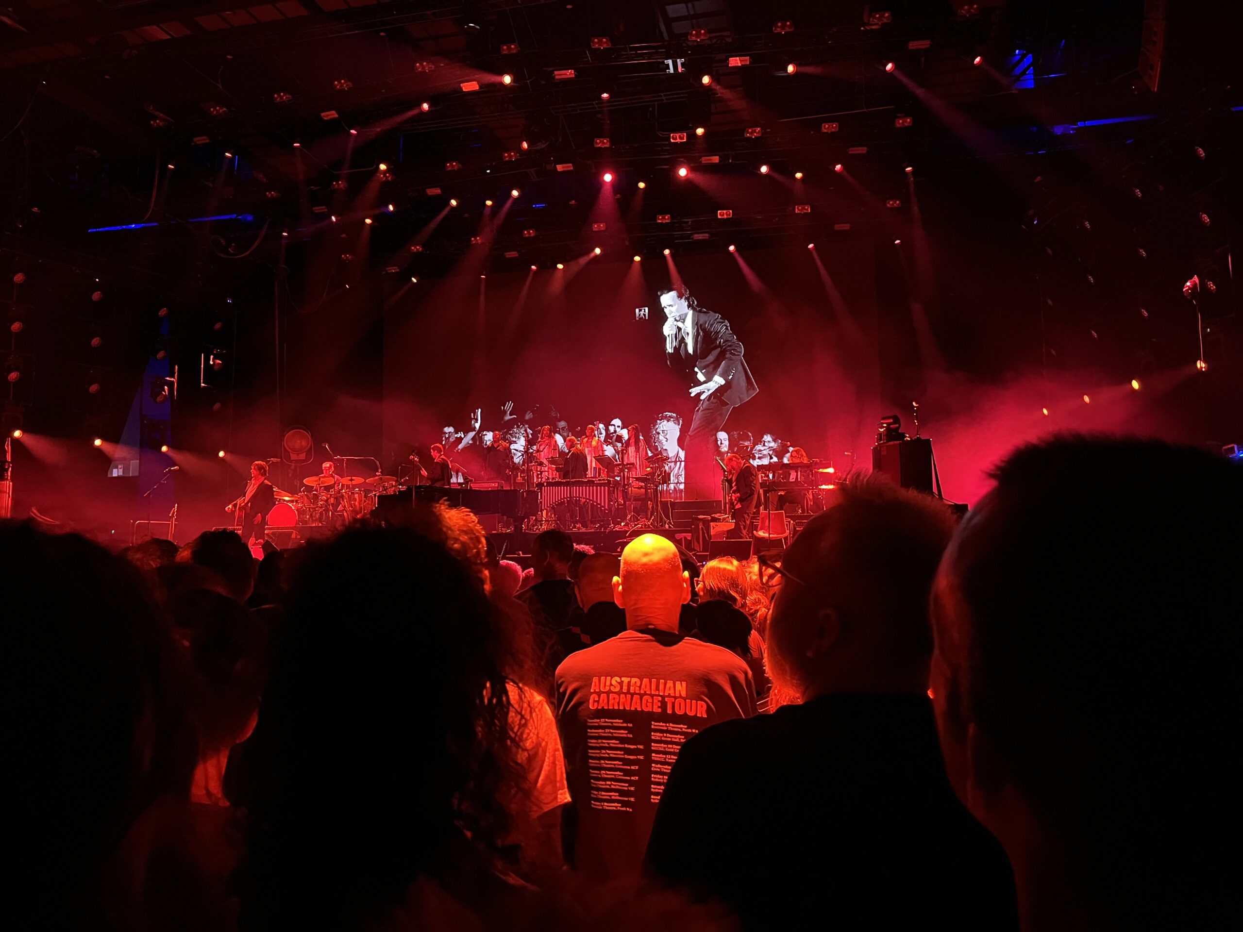 Where Harding had commanded attention through stillness, by leaving space open, Cave commanded it by filling every moment. He moved constantly, within songs and between them, from piano to the very front of the stage and back again, closing the distance, refusing stillness. The Bad Seeds matched his energy, a band of immense control and power, able to turn from thunder to hush without losing shape.