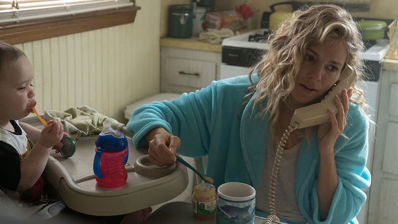 Life is fairly simple for Deb in small-town Pennsylvania; she lives in a modest if not a little run-down house with her teenage daughter and infant grandchild Jesse, the dwelling itself conveniently right across the road from her married with kids sister and Deb’s mom. The opening scenes alluding to not only a strong connection with but almost a reliance on her family’s infallible presence, especially that of her own daughter; unsurprising in many ways when considering that each bore a child at such a young age. Mother and daughter creating a symbiotic relationship more akin to siblings than that of parent and child. Early conversations between Bridget and her mother later replicated between Deb and her sister, Mad Men’s Christina Hendricks.