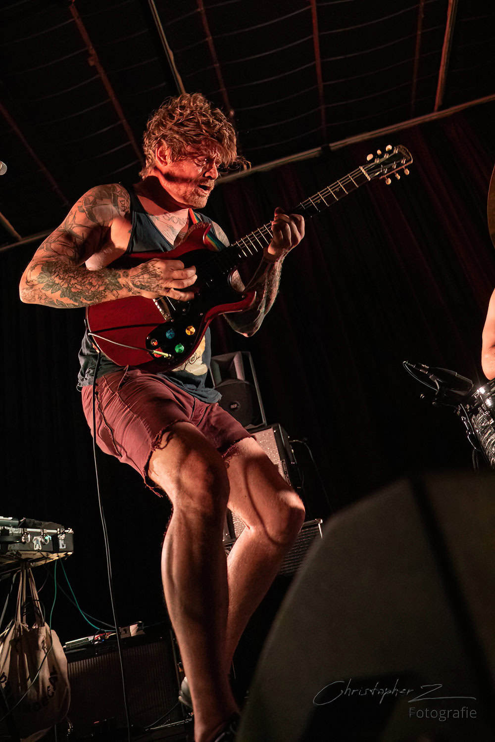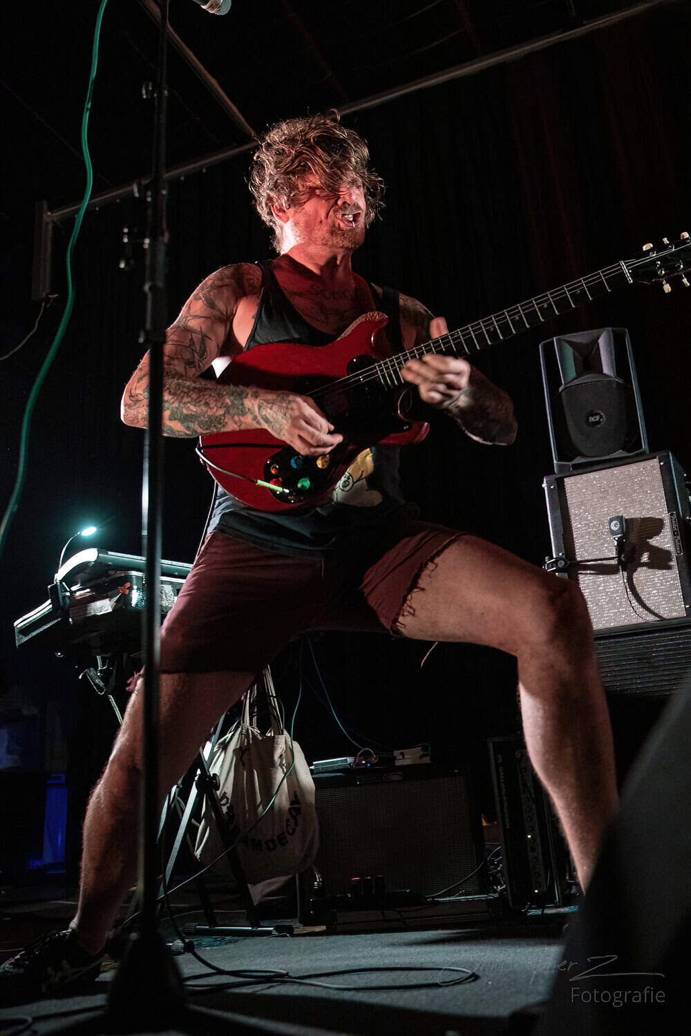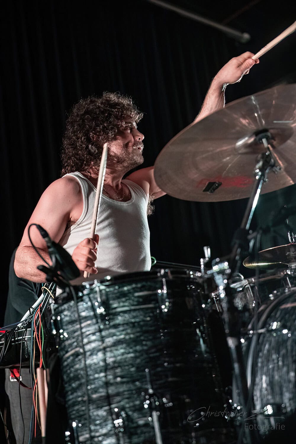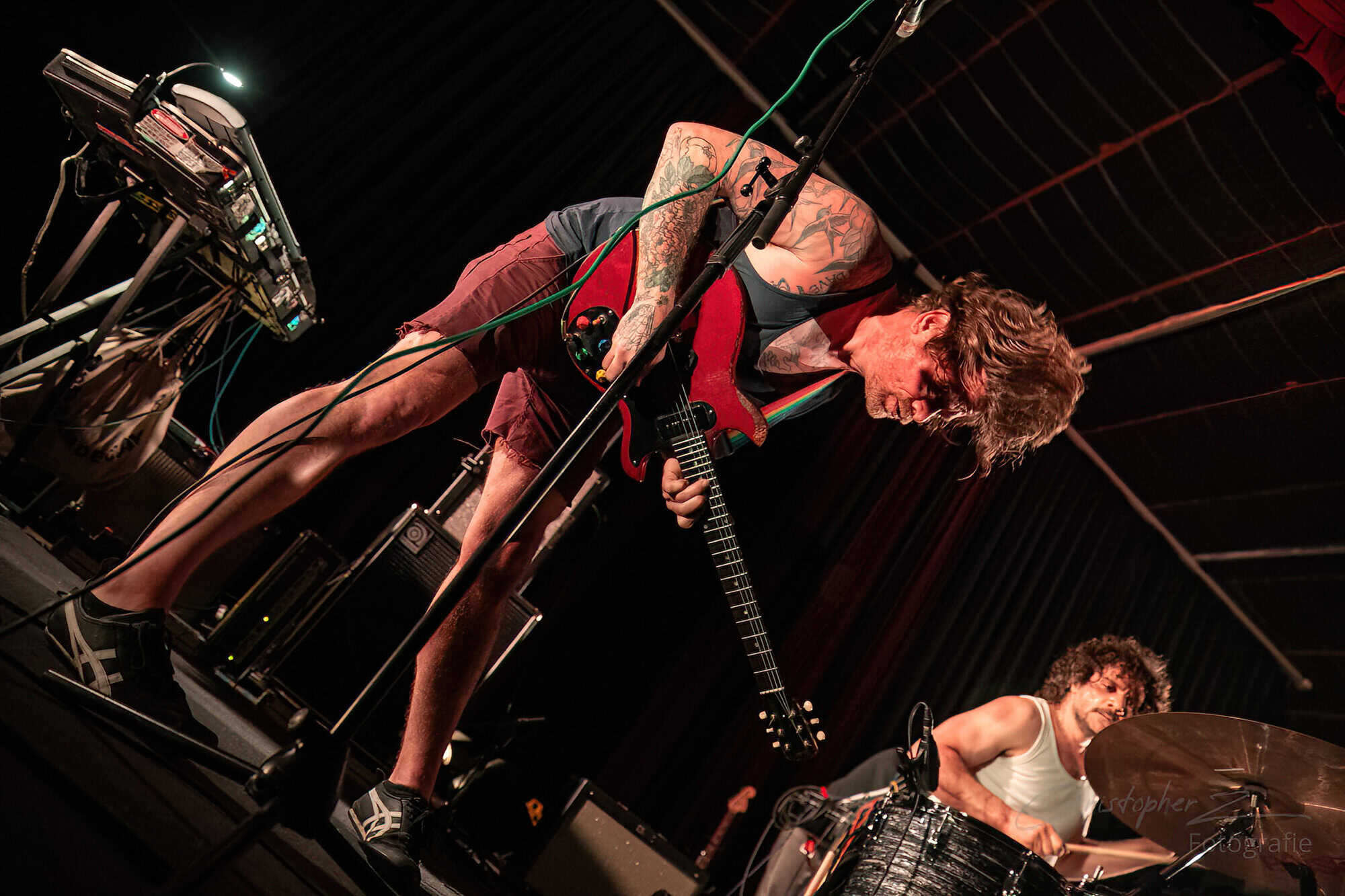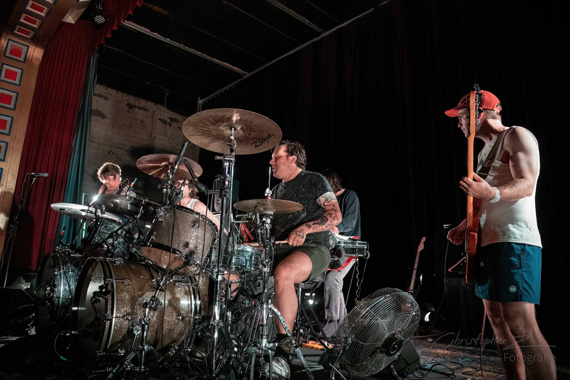 Visually the two-drummer setup is stunning (I remember seeing The Fall and Melvins do the same) thankfully, fears that drummers Dan Rincon and Paul Quattrone will mimic rather than buttress each other are quickly allaid. Playing in-tandem since 2017, they are in-tune, each bringing something different to the table, and with Tim Hellman in on the act on bass, there is a resolute back-beat creating texture and coarseness in the room. There is frenzy, mid set I swear to you that I could’ve been at a Half Japanese or Black Flag hall gig in the 80’s heyday of punk, though the moshpit centre stage is perhaps a little less macho.