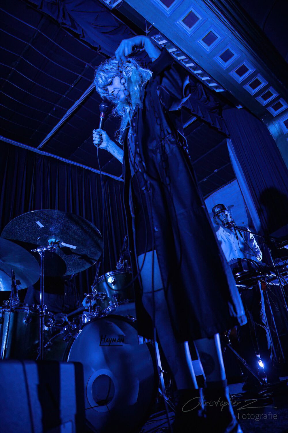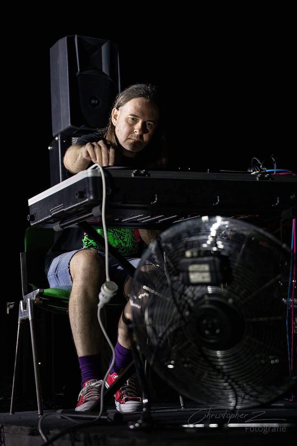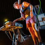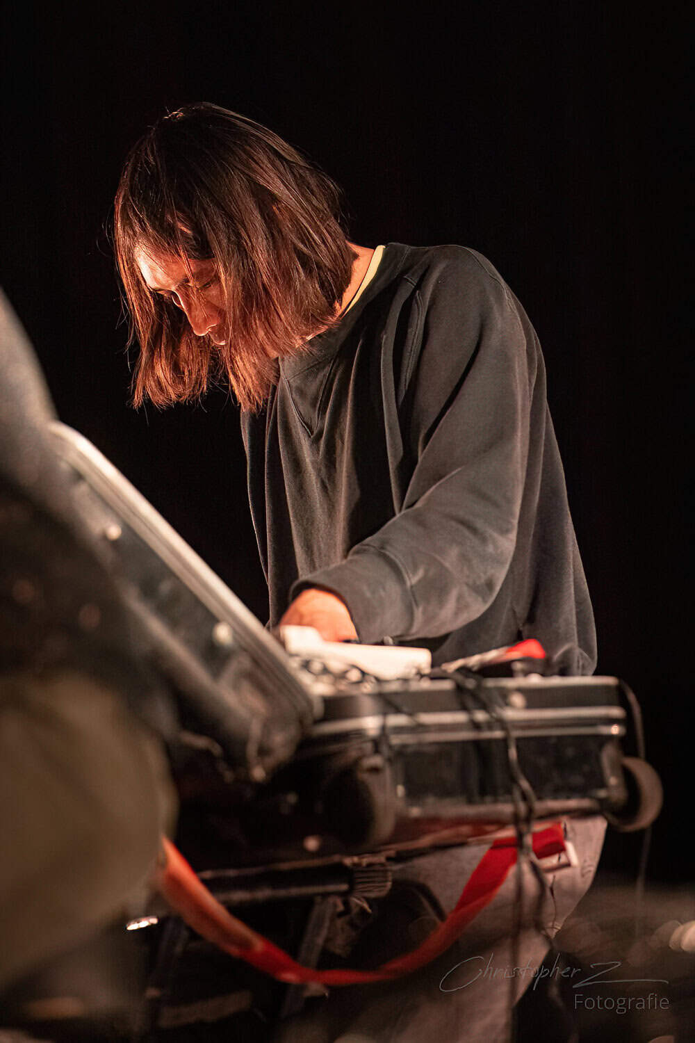 Is one person, Kraus, Pat Kraus or Prince Krauss, (he/Him) who claims that he makes music for freaks, outsiders, losers and weirdos. Kraus performs not just as himself, but also in a multitude of bands that inhabit the fringes of art. Tonight he sits alone, with a table of trinkets (some home crafted) creating an eclectic neo-electronica composites some of which may or may not feature in his 20+ releases. Kraus quietly offers a soundtrack for a filling room, for those in anticipation, via hypnotic rhythms, constructed sounds and ambient electronica. You could try and dance to Kraus’s mahi, but your outer inhibitions might override your inner circadian flamboyants.