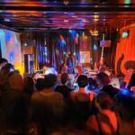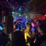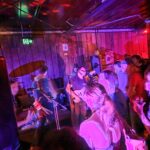 There’s a DJ noodling, creating or playing an Aphex Twin sounding neo-dance soundtrack. It’s not banging the dancefloor (which isn’t in existence, until people remove the giant trestle table in the middle of it) but it’s setting the scene, comfortably numb. As does the plethora of handbags, adorning the dressed – so 1990’s! Woefully though, the tama are dourly dressed, excepting the fellow wearing the 70’s New Romantic’s era style jacket, but I don’t remember moustaches being a thing back then.