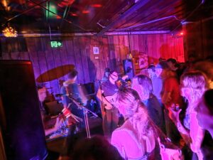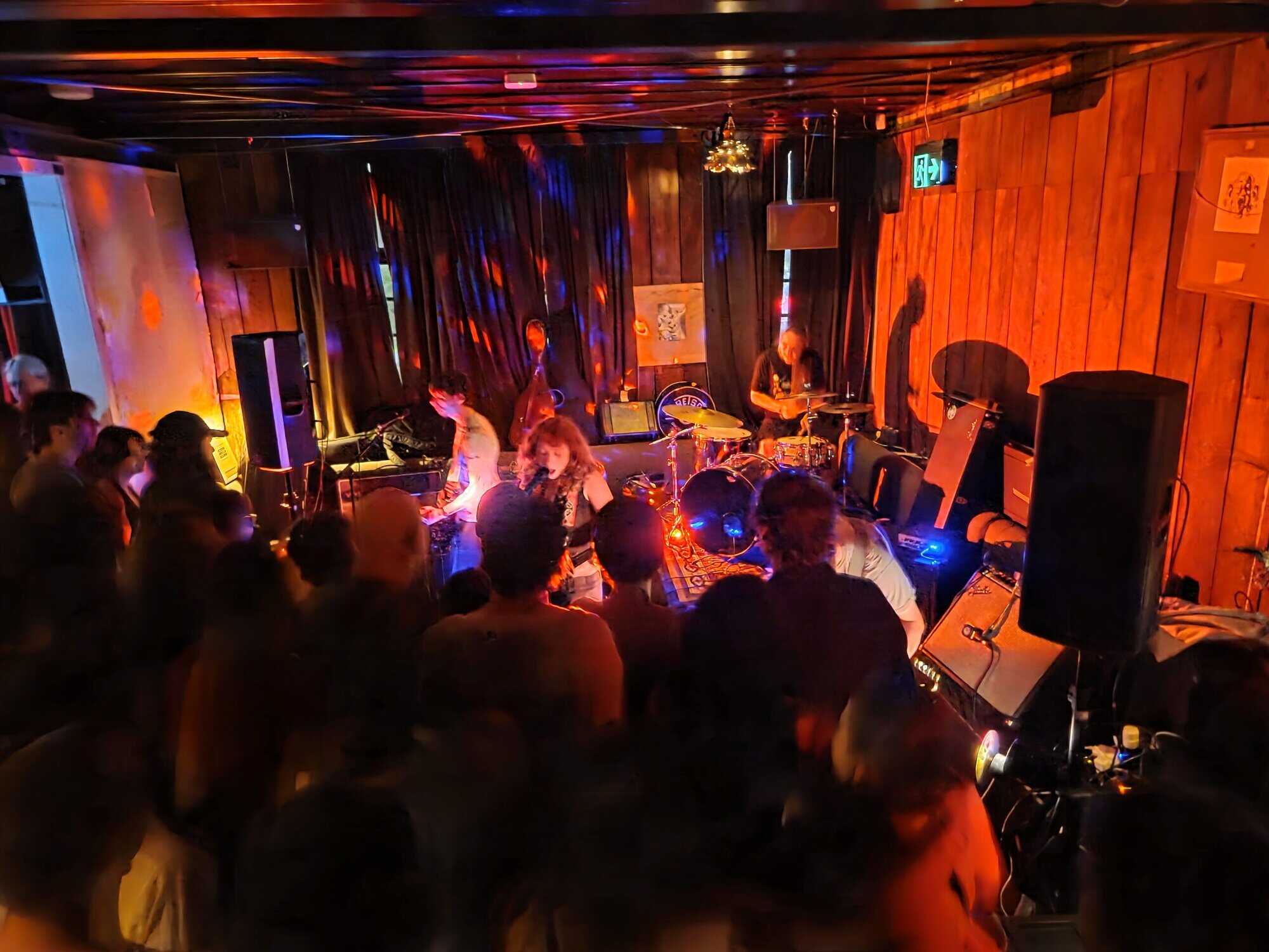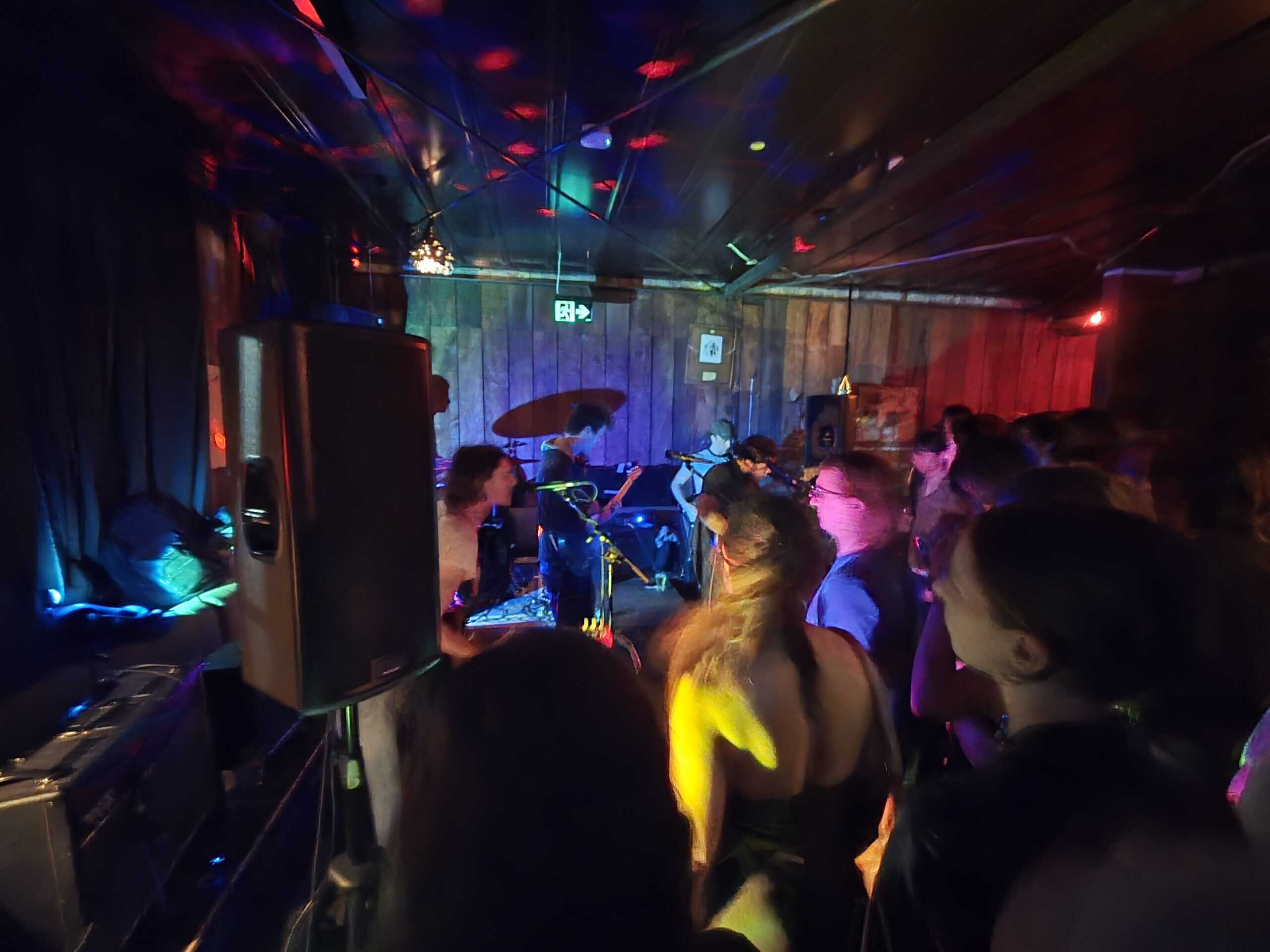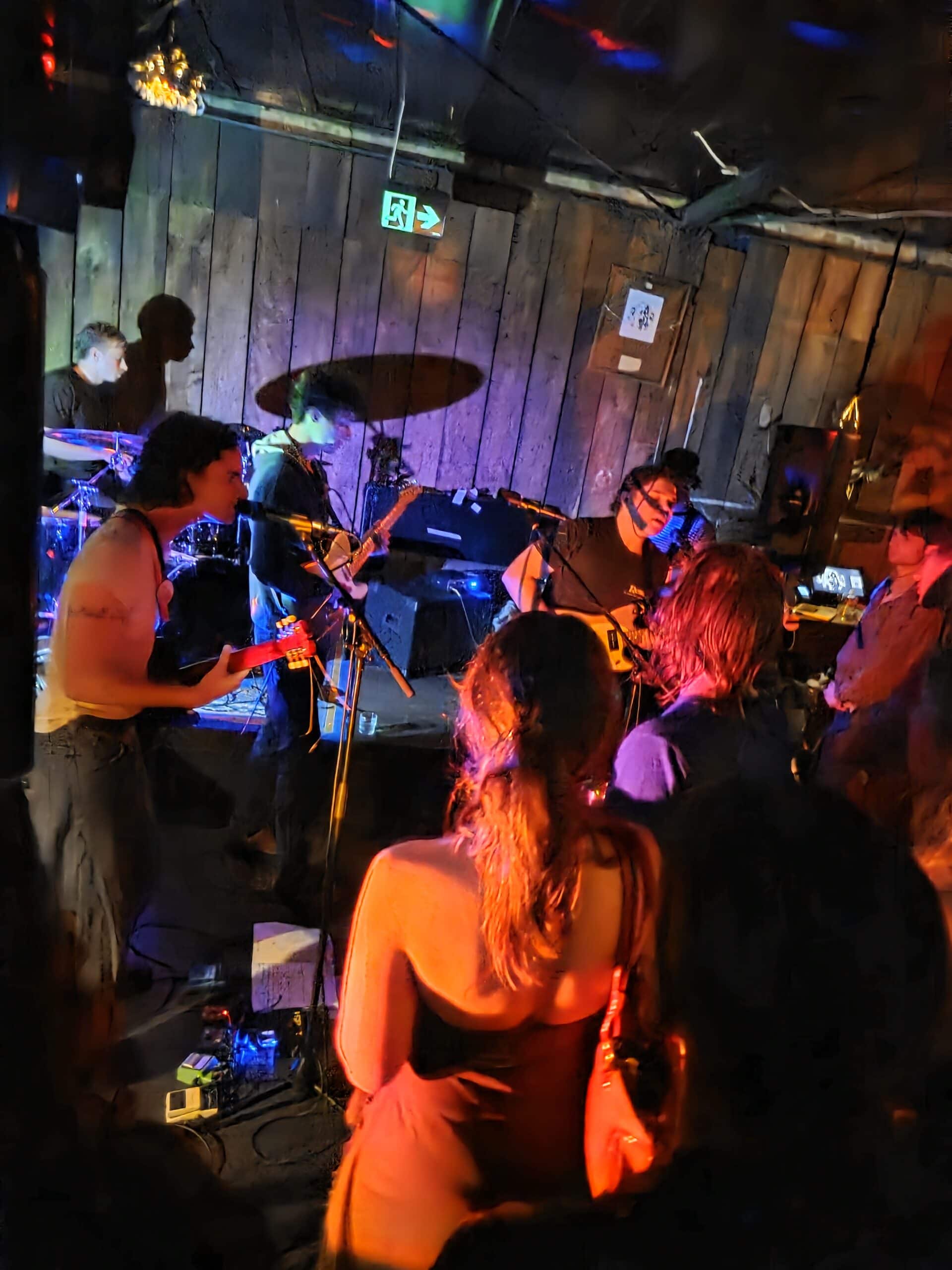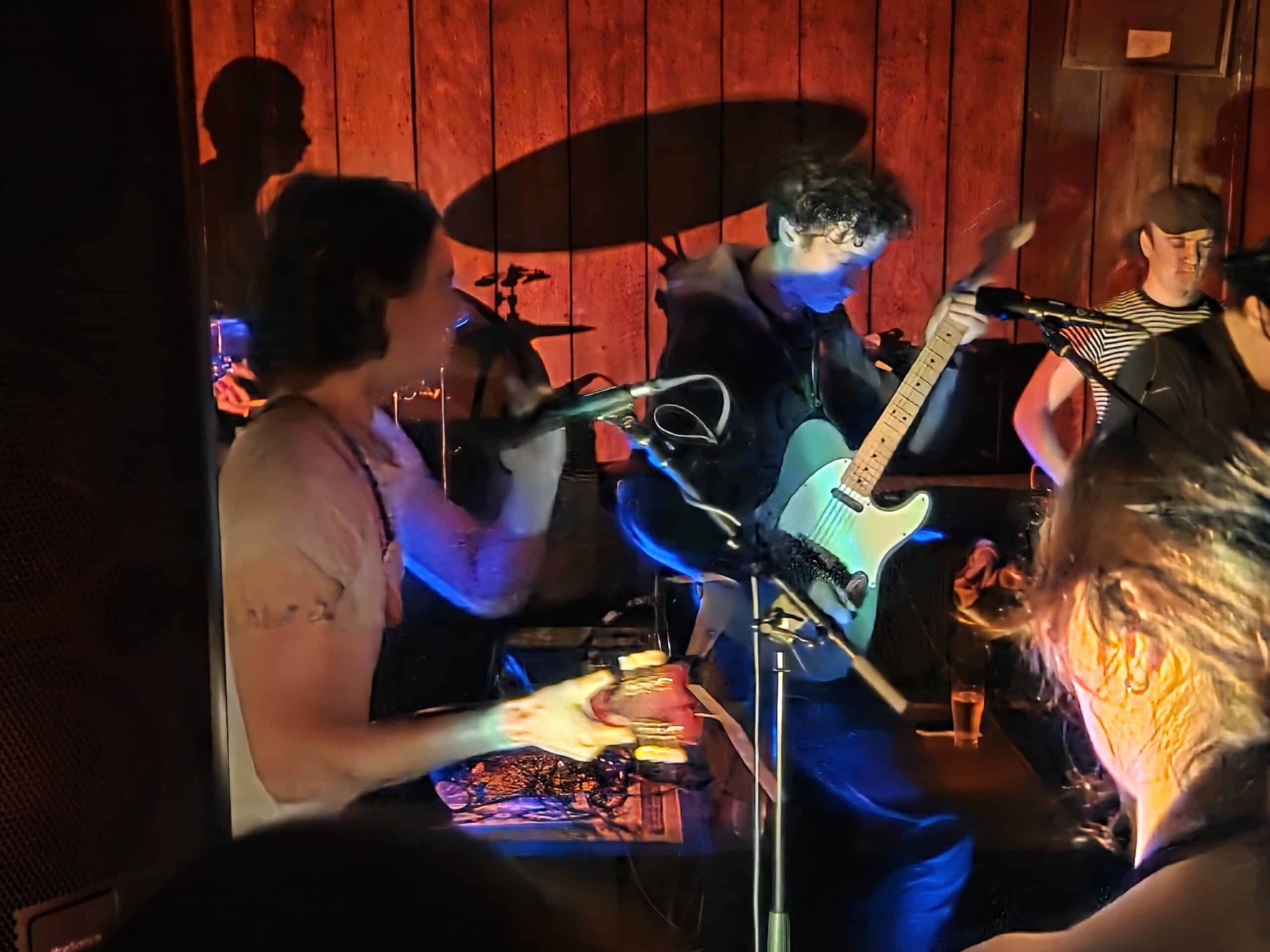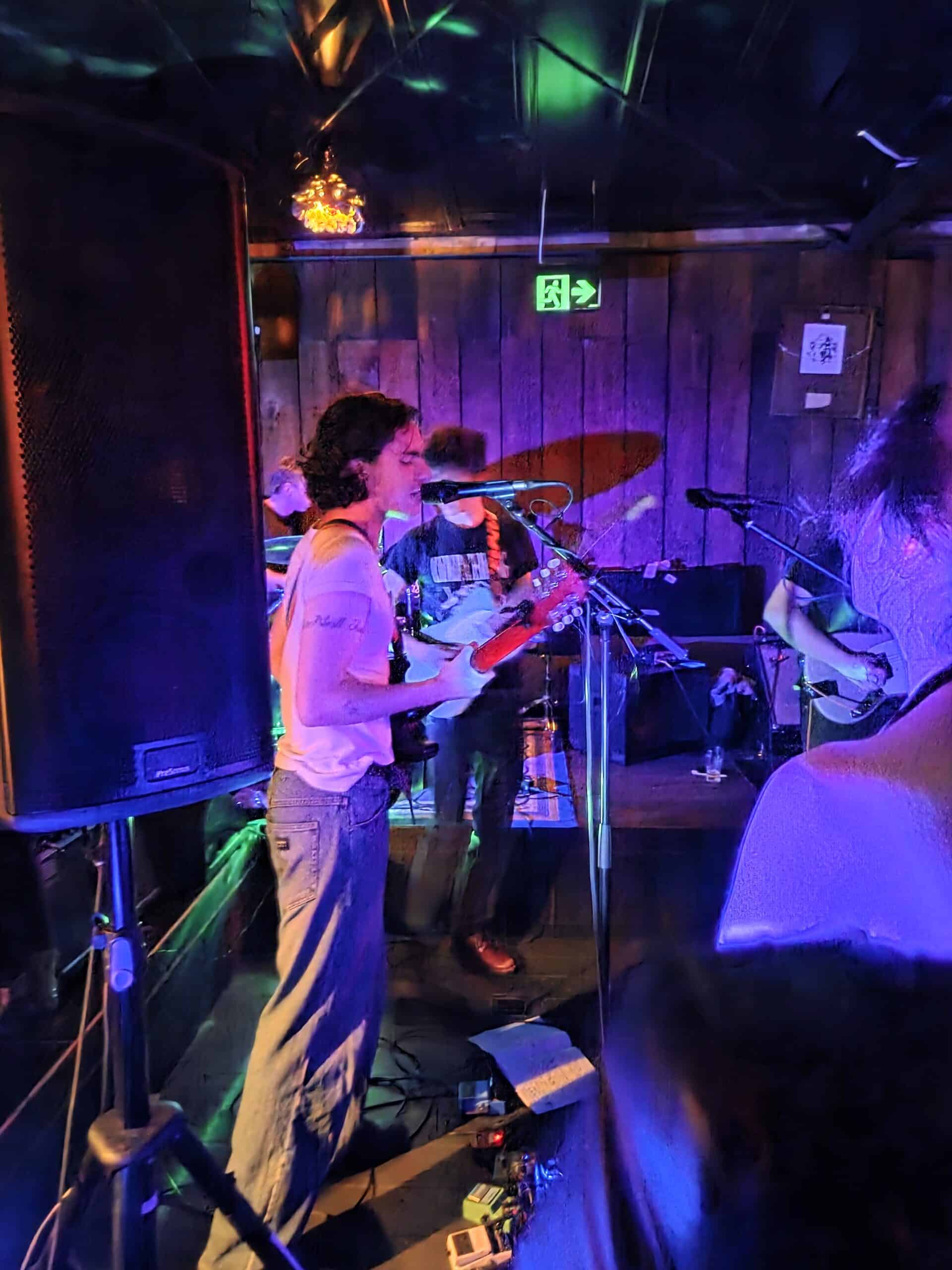 Pissed off by the (likely) retaining wall, we move and roost above a couch opposite the band, the line of sight is preferable, and likely the sound will be better (Our Awning’s korero alludes to the bass being a little quiet, or was that just because there were three guitars?) The masses hear their calling as Pearly* kick off, was it Superglue?, I recognise the tune, the four (on the floor) seek help from notorious soundman Rohan Hunt to right wrongs, and the soundmix dovetails as the next song is introduced.