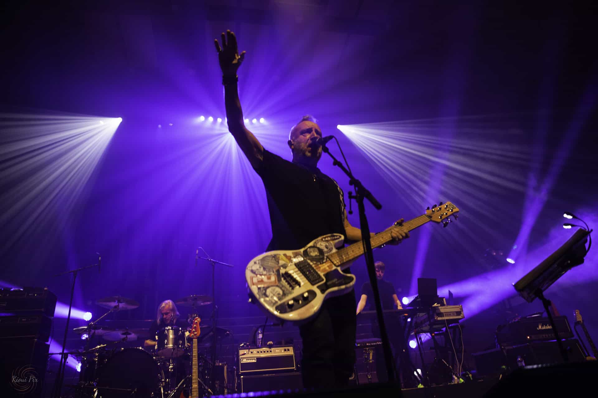 Hooky marches onstage, punching the air (a formidable stage trademark that litters the show tonight) and he and the band start messing with our heads by playing two b-side: In a Lonely Place (Ceremony) and Cries and Whispers (from Everything’s Gone Green) the trainspotters are excited early on.