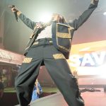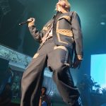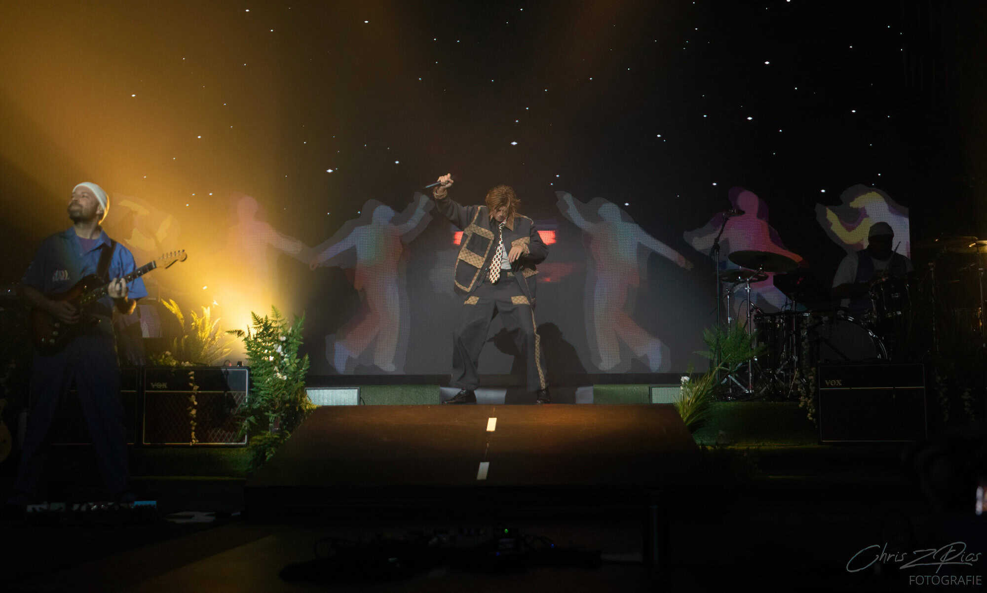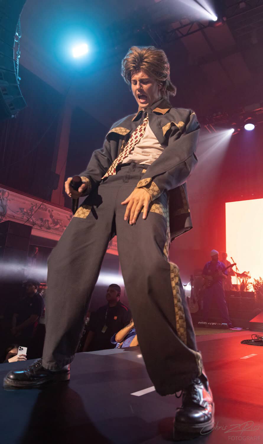 Indeed, he does jump into the crowd later as his blue-clad roadies keep him safe. And his band, a trio consisting of musical director/keyboard player Beau Golden, guitarist Daniel Walsh and drummer Michael Avenaim, are with him all the way.