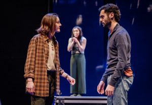 The costumes too were straightforward yet ingeniously designed to facilitate quick character transformations. A simple zip-up sweater effortlessly changed Arlo Green from a Silicon Valley/TED Talk presenter to a Scottish activist experiencing a mental breakdown. (This gives you some idea of the scale of change!) Similarly, Amanda Tito’s loose flannel shifted her role from an unwilling town hall participant to a grief-stricken mother, creating a captivating transformation on stage.