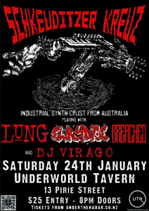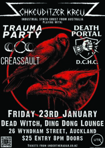 Fresh from extensive touring across Europe (Sept-Oct 2025) and Australia (Nov-Dec 2025), New Zealand-born / Australian-based Industrial Synth Crust artist Schkeuditzer Kreuz, a.k.a. Kieren Hills, is about to wrap up the international Swan Grinding Tour with two Aotearoa shows in Auckland and Wellington. On tour in support of the third studio LP, Swan Grinder, on Friday, 23 January 2026, Schkeuditzer Kreuz plays at Dead Witch, Ding Dong Lounge in Tāmaki Makaurau, joined by Waiheke Island post-punk outfit TRAUMA PARTY; Whangārei hardcore thrash mongers DEATH PORTAL; and Tāmaki dark experimental electronic project CREASSAULT. The following night, Saturday, 24 January 2026, Schkeuditzer Kreuz hits Pōneke’s Underworld Tavern, alongside industrial noise-rock legends LUNG; shiny new emo-core band EURYDICE; post-punk duo BREACHES; and goth DJ VIRAGO (Dark Entries, ex-Dark Eighties).