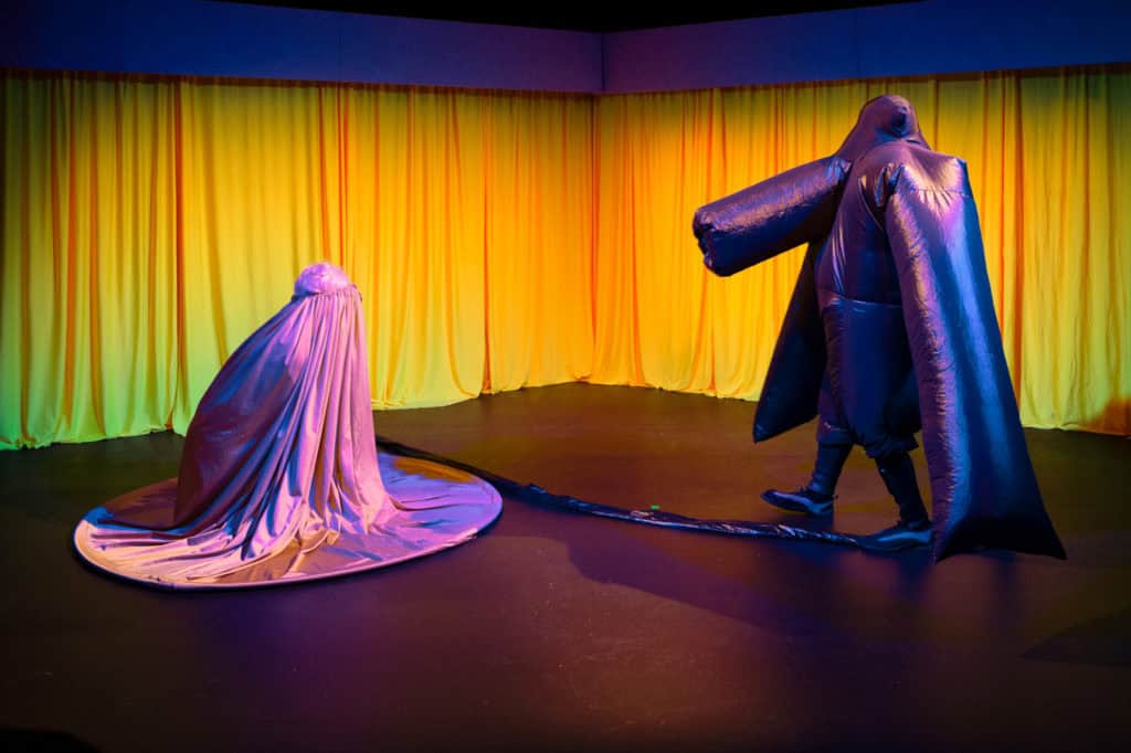 In the beginning there are the yellow curtains, vibrant, fluttering. And there is a lump on the floor, encircled by fleshy fabric. And then there’s one of those floppy balloon men, frantically flopping. And out of this primordial ooze, a couple is born – an opposite sex couple, one man, one woman.