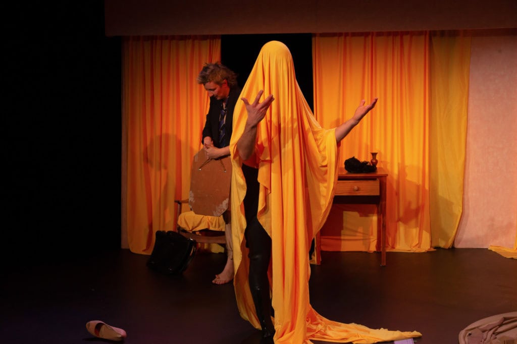 Thanks to a helping hand from those lustrous yellow curtains, they are given everything they need to become the man and woman they are destined by society to become. They don’t get to choose anything – she gets her stuff, he gets his. And so the struggle begins – with a strangely non-verbal clowning set-piece, tearing through the minutiae of domestic life, set to a perfectly appropriate, or completely inappropriate sound track.
