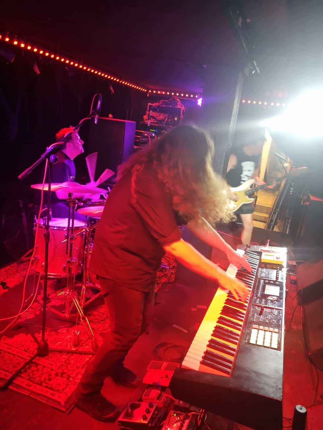 Melody emerges from the onstage soundcheck noise, as Spotlights begin, it’s a little rough, methinks the band are seriously jetlagged (it gets mentioned later by Sarah) HOWEVER the sounds emanating get progressively refined thanks to the Touch of a god, Mark on the mixing desk does his magic.