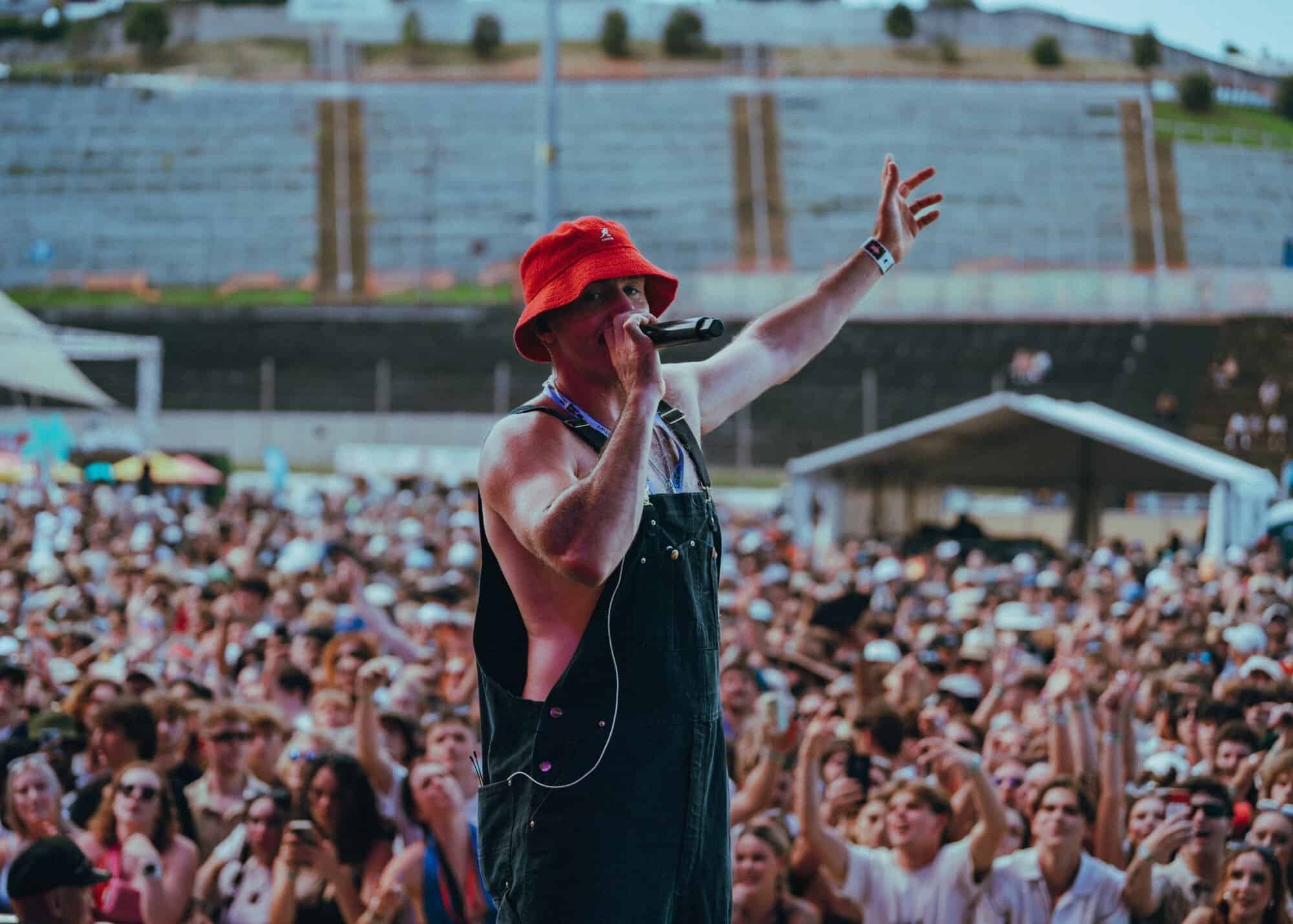 Dope Lemon is slowly becoming a regular in Aotearoa. I had planned to catch more of his set until a friend told me off because I would miss Dominic Fike and I would get the opportunity to catch Dope Lemon again soon enough. Indeed, I hear rumours of Angus and Julia Stone touring again. Well, for those who don’t know, Dope Lemon is Angus Stone’s mid-life crisis and like most mid-life crises we may have hidden opinions and criticisms but it’s often best just to sit back and enjoy the show. That’s what Dope Lemon brings, as the day was finally cooling down most people gathered around the Pine Tree Bend stage simply sat back or bopped from side to side as the band grooved and the air began to smell real nice. I am generally not a huge fan of surf rock but if it’s done well I can make an exception; in Dope Lemon’s case, I did. The whole vibe of the band is, in one word, steezy. They’re all wearing cool suits that look like they’re thrifted yet they’re cohesive throughout the band. Angus is slow in all his movements, lifting his hat off his hat in a long salute to the audience, or climbing onto the drum riser via a bit of a detour to jam with the drummer. Someone guides two dancers in papier-mâché cat heads onto the stage to complement his latest and most well-known tune, and with that, his set wraps up nicely.