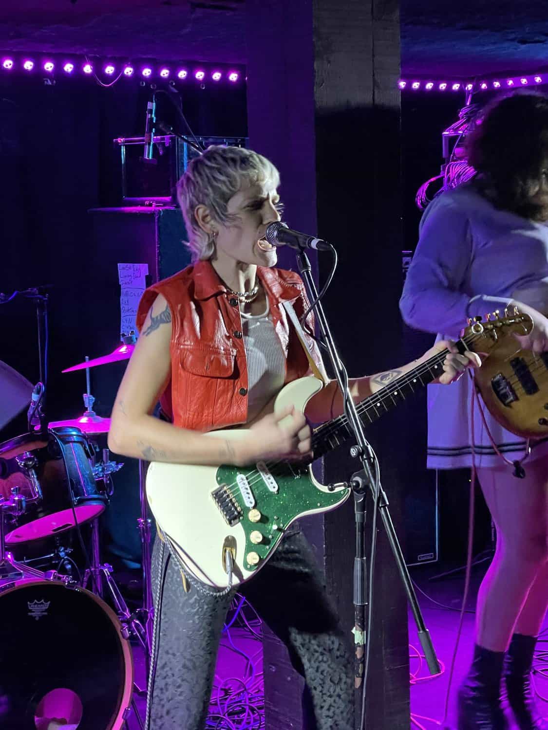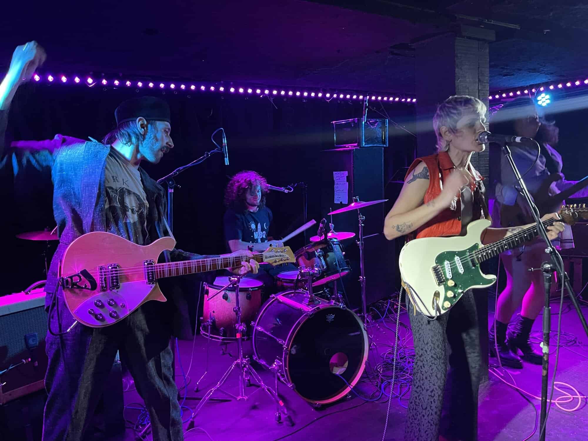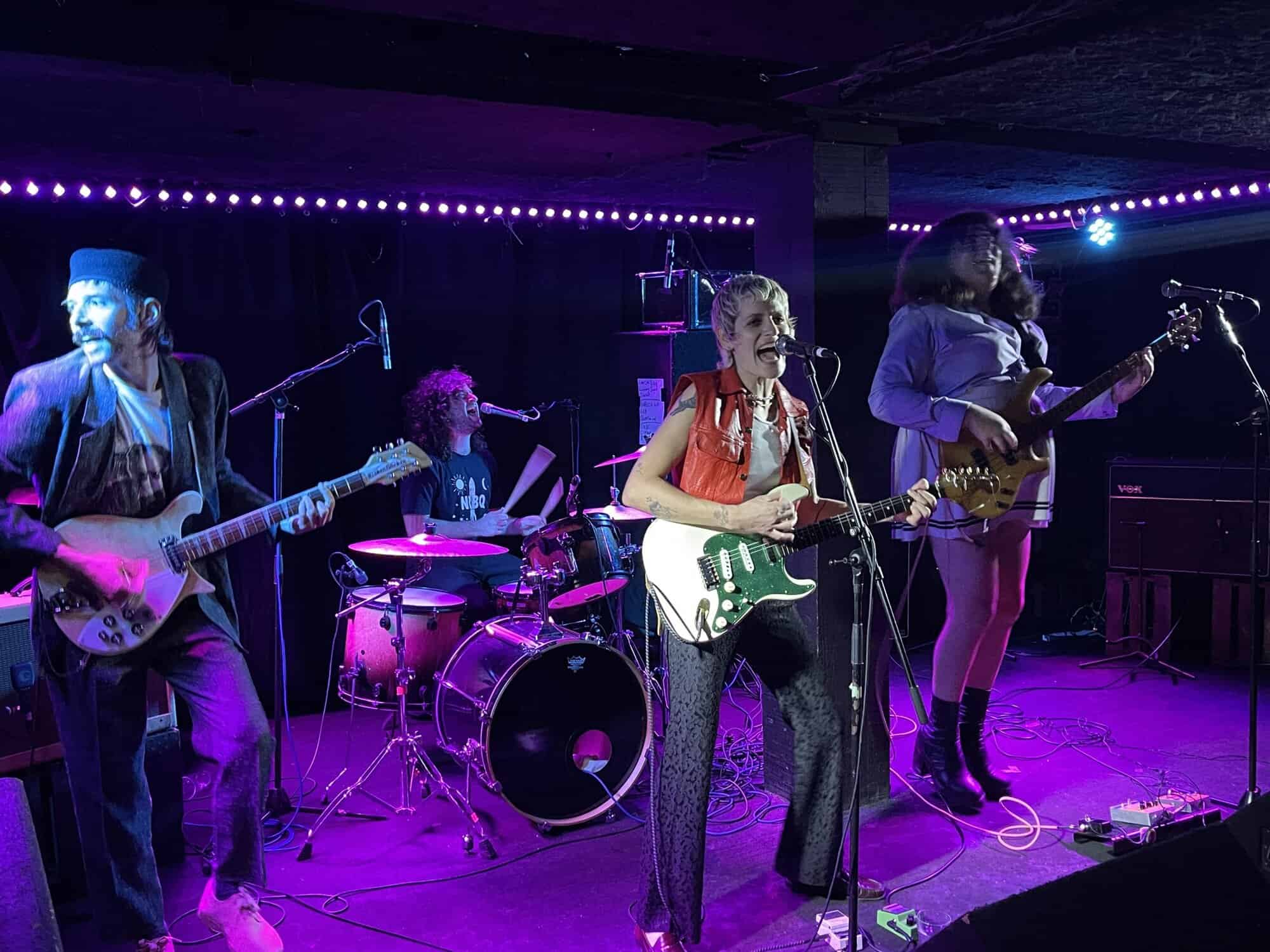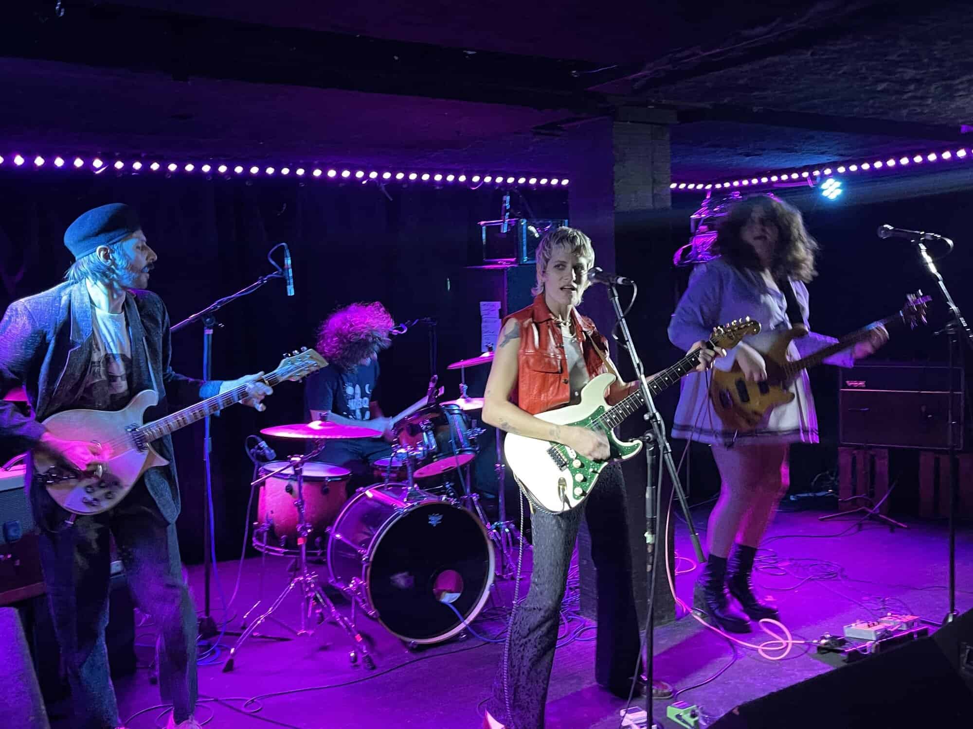 Onstage, Saara Untracht-Oakner is joined by bassist Josephine (The Josephine Network), drummer Max Hersh (Dirty Fences) and Nat Brower all of whom have their own or another group. Onstage they project all manner of punk glam style, (Saara’s shoes are the bomb) circa 1974 just as punk is being created out of the collapse of Woodstock, and the disillusionment caused by the Vietnam War.
