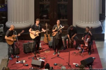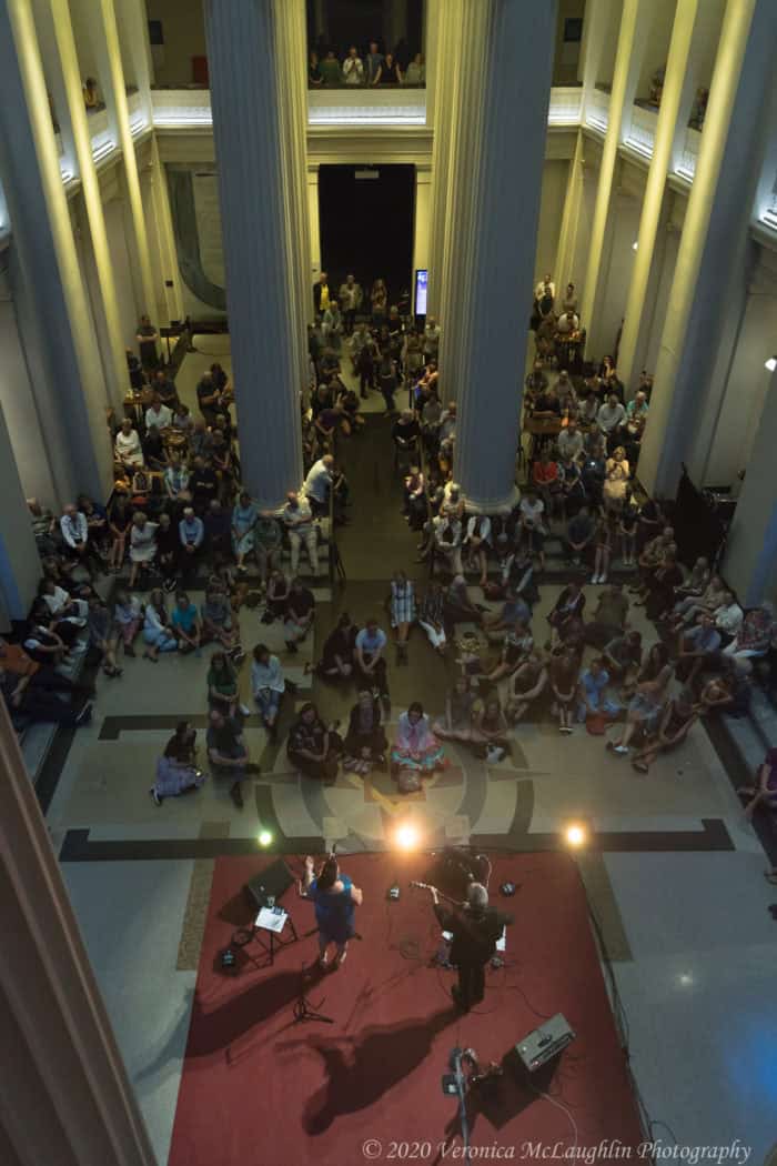 The Grand Foyer of the Auckland Museum is certainly grand – massive columns, marble staircases, glorious artwork, with superb acoustics. The show was sold-out, a mainly boomer crowd. Small tables and stools were scattered throughout the room, a little cheese and crackers, plenty of wine and lager on hand – the atmosphere was rather like a posh picnic. With a large red carpet on the floor for a stage.