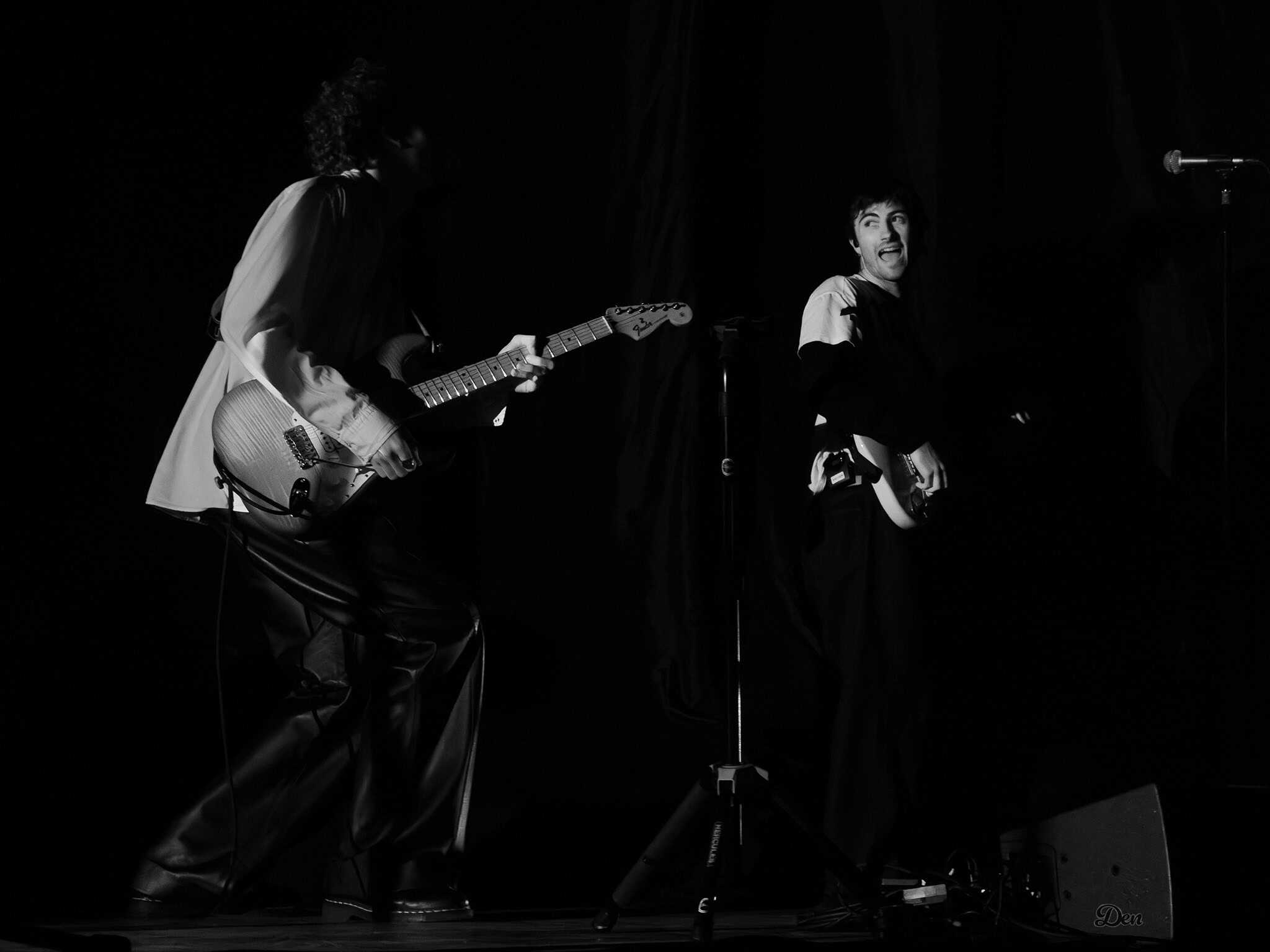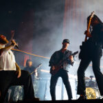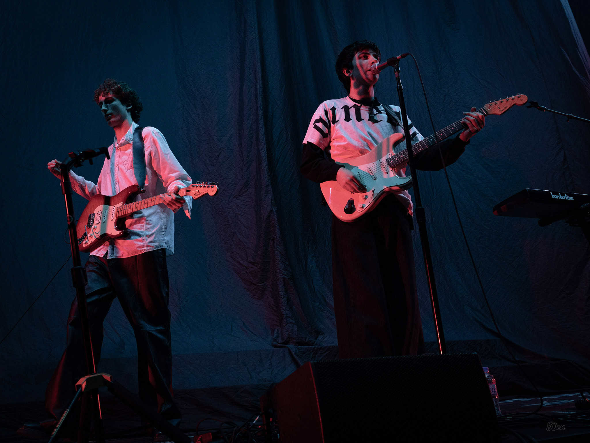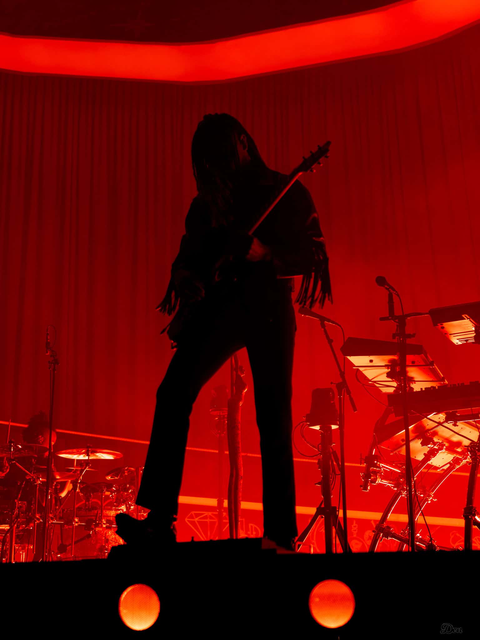 Swims came to the stage at 9pm on the dot – rather late for a midweek Arena-going audience, many of whom appeared to have been drinking their way toward curtain up. Actually, it was more curtain down – a dramatic drop to reveal a red-draped, sophisticated set with a lit podium and curved ramp, more reminiscent of a 1930s nightclub than a contemporary rock stage.