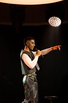 Excitement was palpable ahead as a projected digital clock counted down with the audience joining in for the last seconds. Then whoops of delight as the man himself appeared on a small satellite stage under stark spotlight beam. The Just for Tonight show was underway with the sound of waves and images of Teeks in a car heading to the coast. The 20-something Te Karehana Gardiner-Toi made his way to the central stage in black leather pants and sleeveless top.