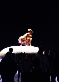 “Live” dance action is interspersed with impressive animation, exploring our response to external stimuli. Ieremia’s personal responses to stimuli and experiences are  explored in a memoir piece backed by “My Favourite Things”, providing a swift trip through New Zealand’s history from the 1960s onwards, featuring both family pictures and footage from key events which have shaped today’s Aotearoa. This speaks to the purpose of the installation, described by Ieremia as “to create transformational dance experiences that represent our unique place in the Pacific”. While we could have been anywhere in our tall, futuristic, dark cylinder, New Zealand’s place in the Pacific was definitely illustrated in this portion of the piece.