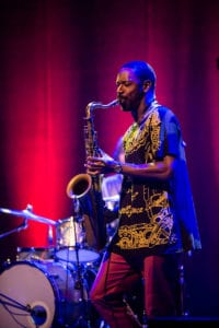 This crew managed to do so much with so little, and this is impressive.  The poncho wearing hippy presence of Danalogue, leaning over two simple synth-keyboards was something of an illusion, given the myriad of sounds and loops he produced as he frantically twiddled knobs and consciously pounded keys over and over more like a drummer than a pianist.  Betamax’s drumming was just simply stunning.  Watching him was like a calm and gliding duck – on the surface he was tranquil, but underneath frantic rhythms and counter-rhythms are exploding.  His solo used a mixed of drum kit and a digitised tom to produce some unique and surprising sounds.  These weren’t the usual rolling and building constructions you get with jazz.  He’s like four drum machines all going at once – Drum and bass; Hip hop and syncopation (think Brubeck or Krupa) all at one!  Now while that was impressive, you can’t leave out the stunning energy exuded from King Shabaka’s sax.  Using a simple reverb tool he created layer upon layer upon layer of beats and punches.  His style is more like Fela Kuti than Bird.  The aim is to create these sophisticated patterns, like aural fractals.  It’s more like a texture than a melody that he’s creating.  But wow! What textures.