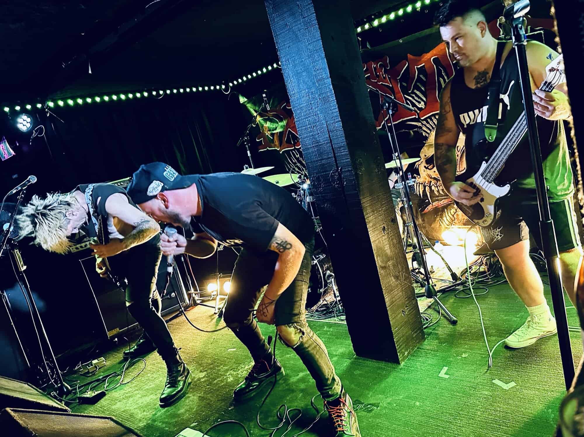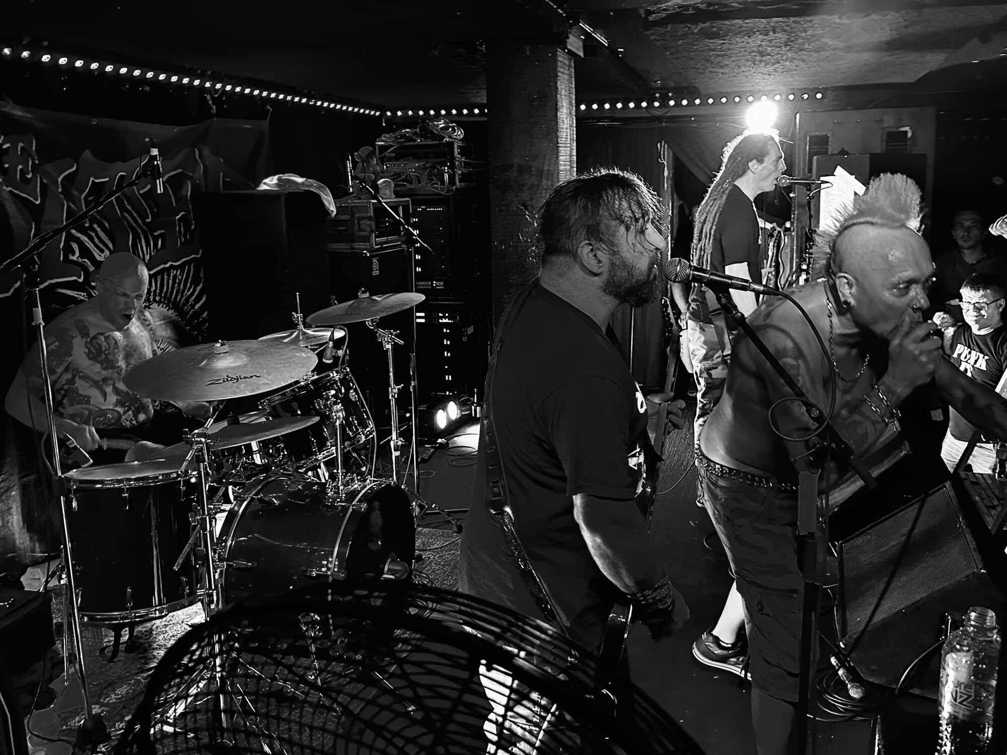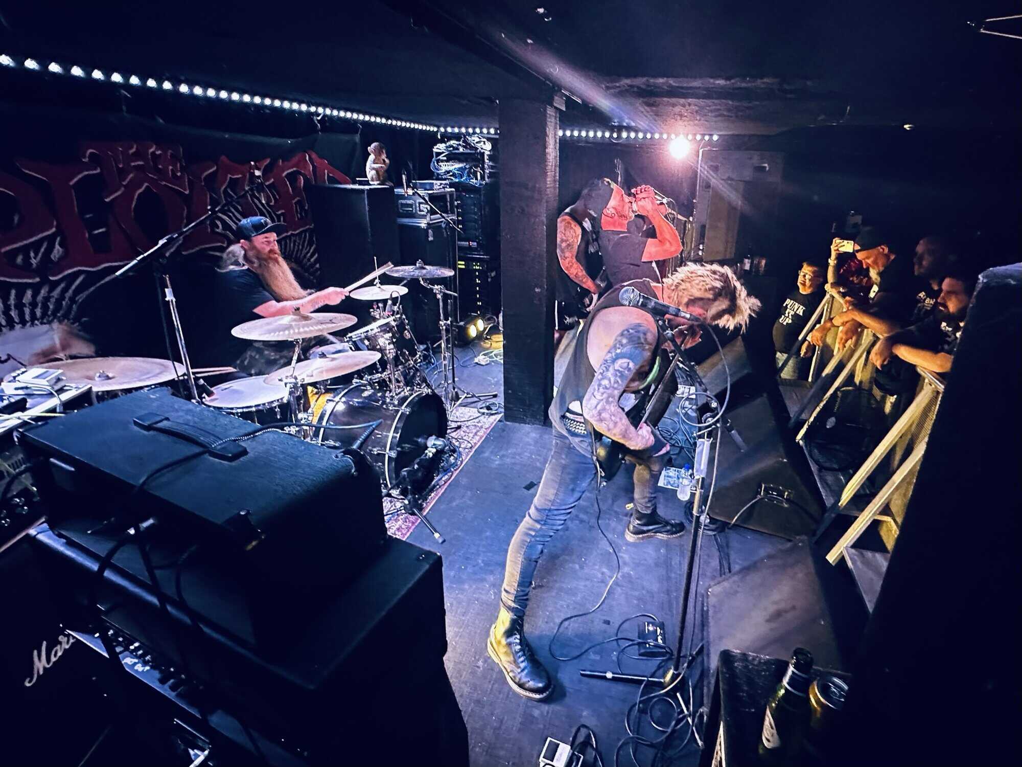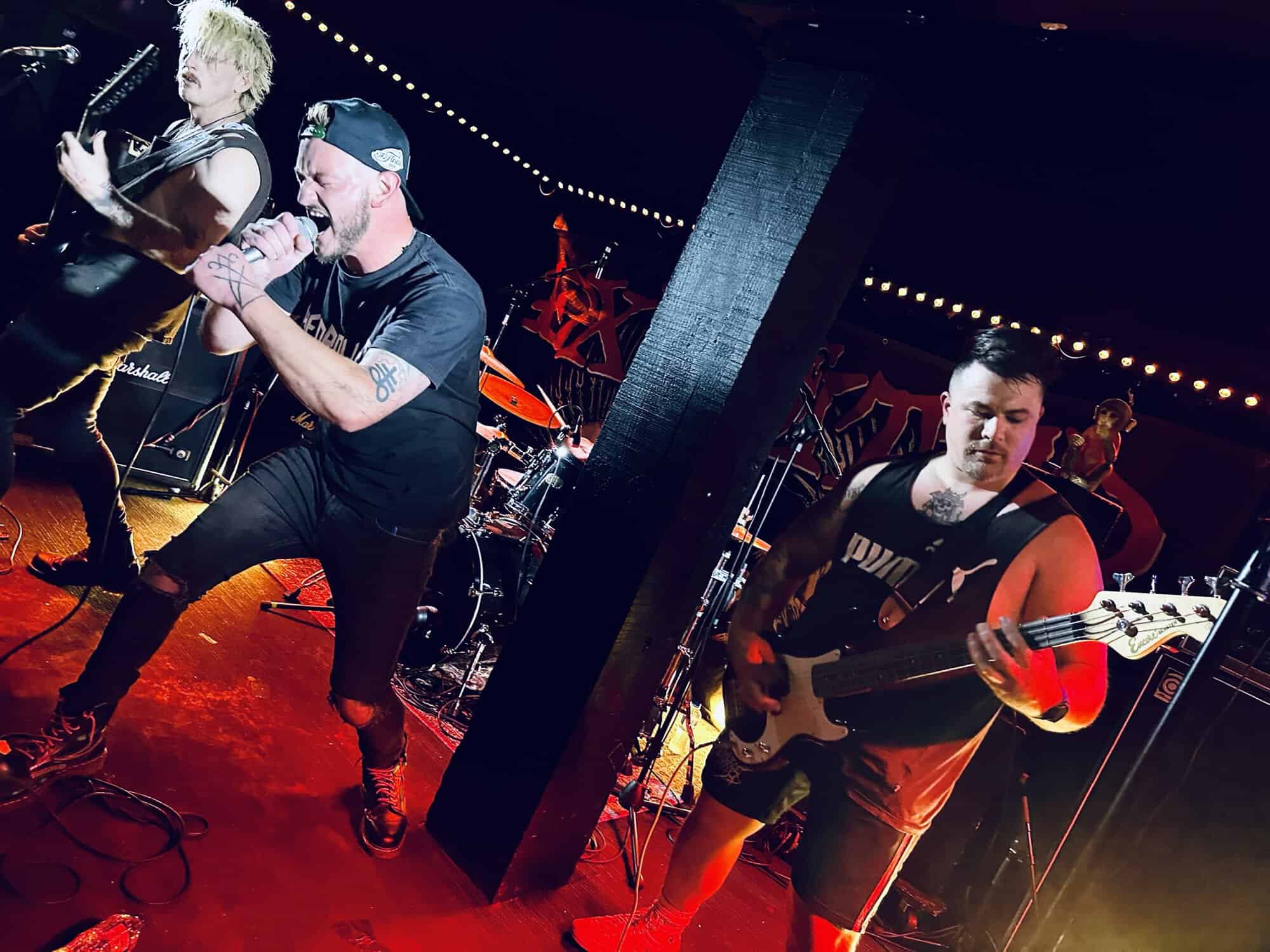 previously opened for The Exploited on the 2020 NZ tour. Much more metal than D.O.P., the drawl(ing) vocals and unrelenting sound bed at times made me feel like I was bashing my head against a brick wall continuously. Very much focused around vocals and guitar, their skills are obvious, but the lack of harmonic contrast did create a feeling of being battered by a monolithic sledgehammer. Their faithful fans were vocal in their support, but with their drummer supporting a bigger beard than the sound guy, being much, much, much more metal than D.O.P……..they could’ve (should’ve) been opening for Behemoth up the road.
