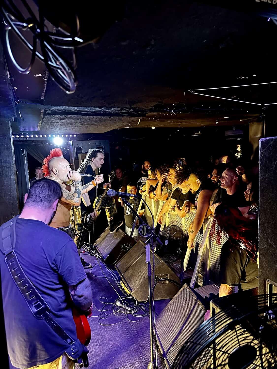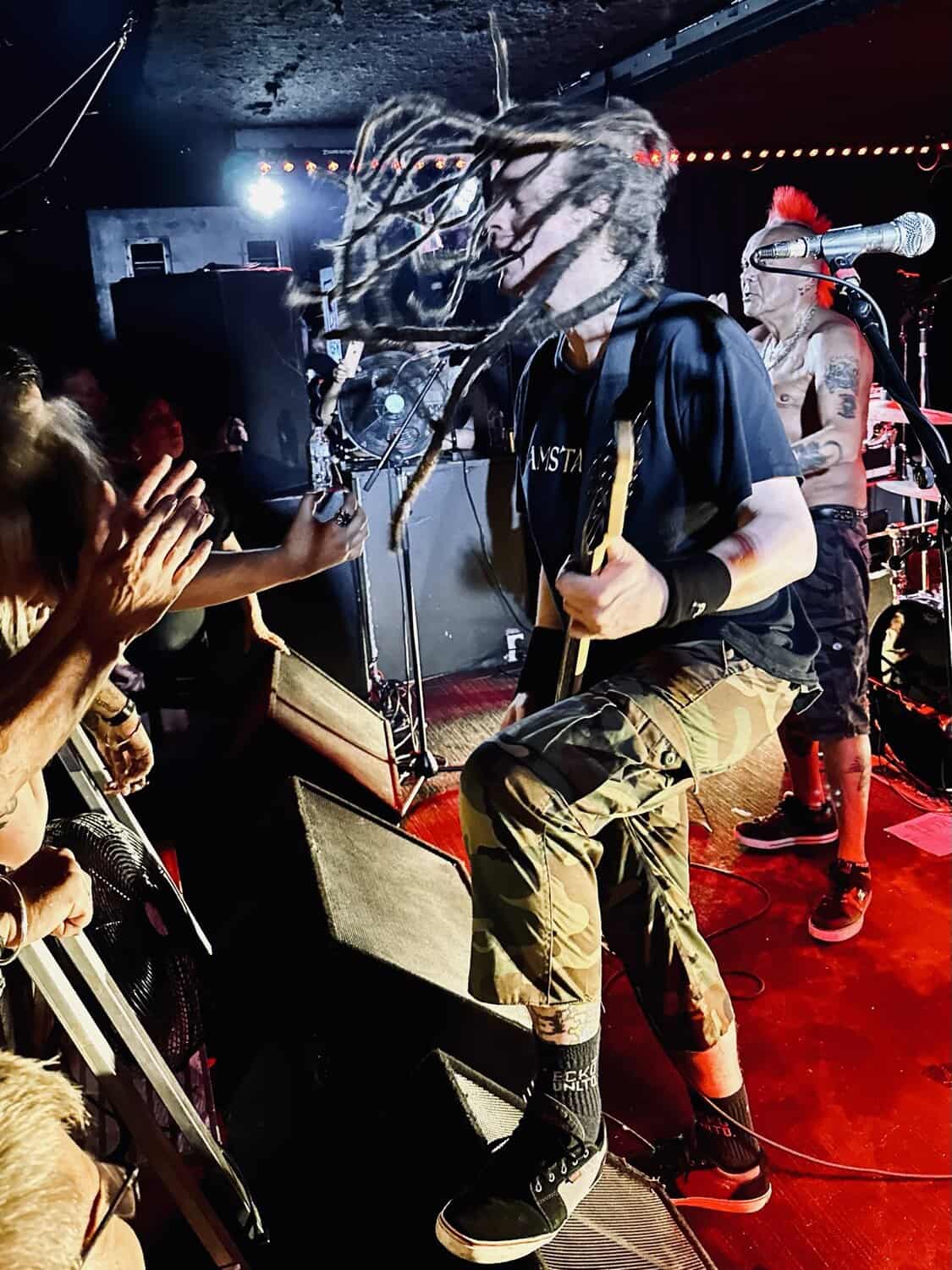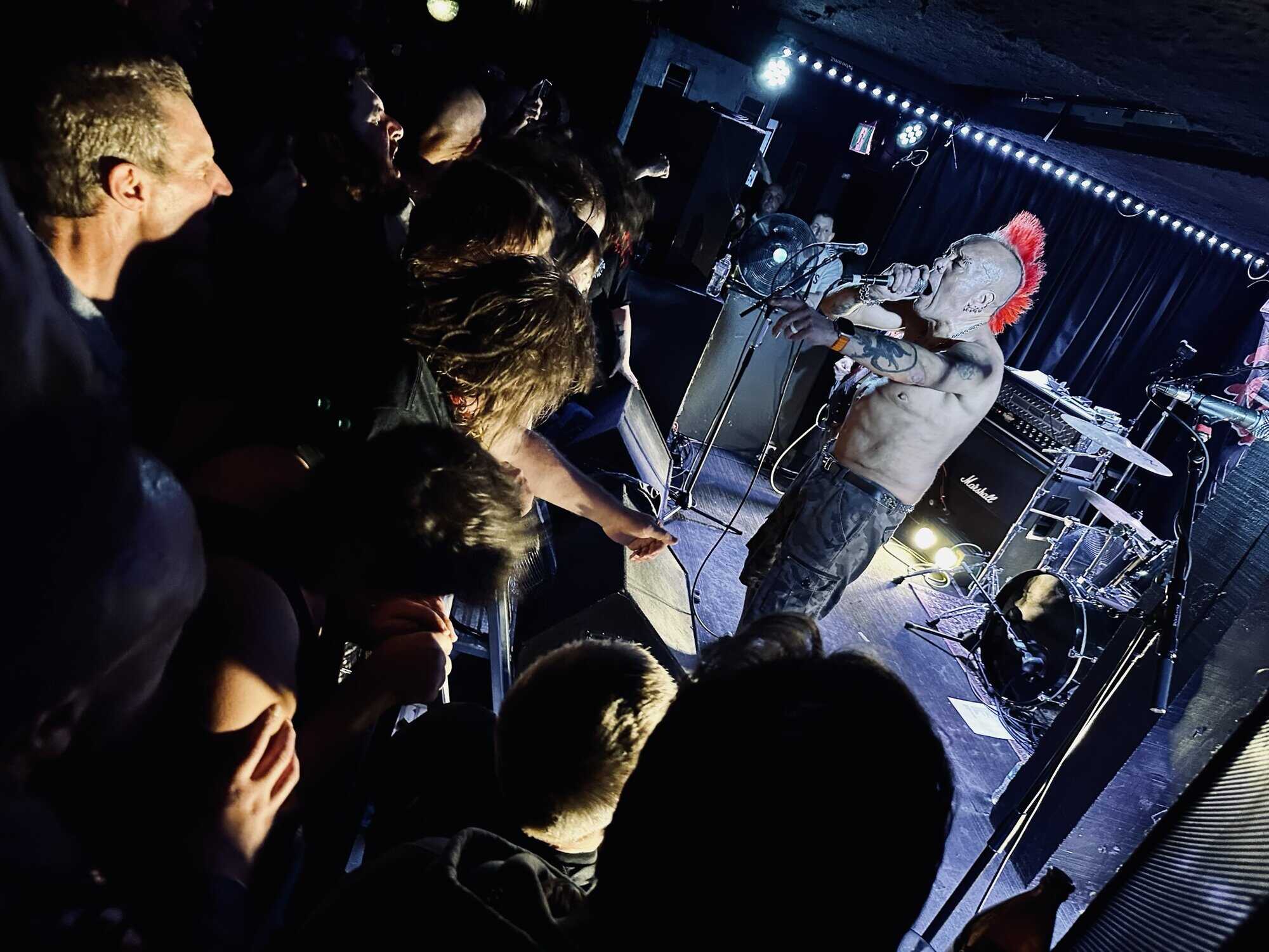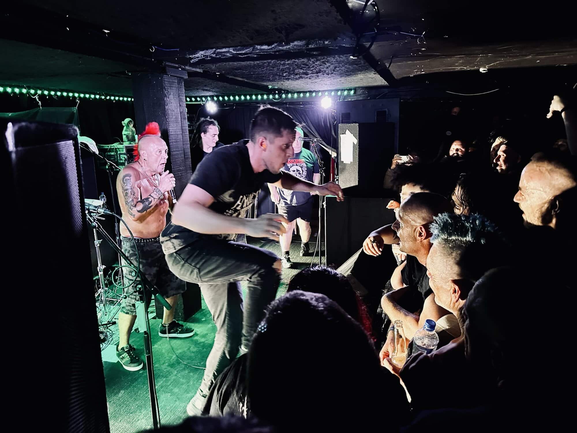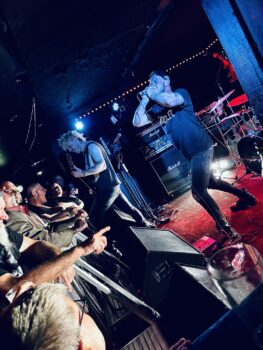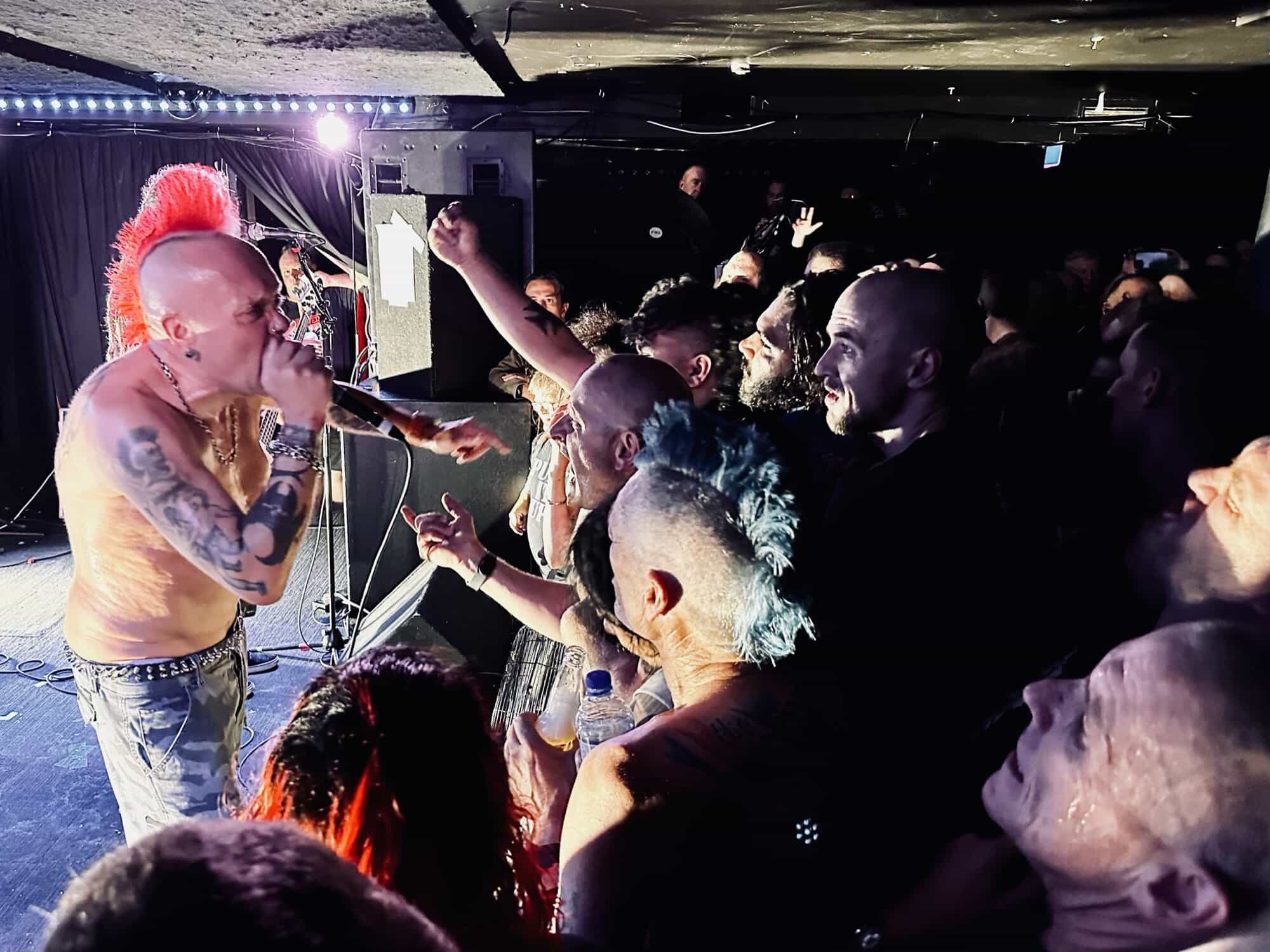 With little banter (a gruff ‘Alright’), The Exploited launched into Let’s Start a War, and the moshing in the Whammy Bar began. Mention is made at the end of punching through the first three songs (which sound tight and well-delivered, since The Exploited have arrived in Tamaki Makaurau at the end of a dozen shows through AUS/NZ) that it’s been three years since guitarist Stevie’s first shows with the band, that 2020 NZ Tour being part of it. Dogs of War starts the crowd singing along, and Wattie shares the vocals duties with the brave upfront souls being crushed on the barrier.