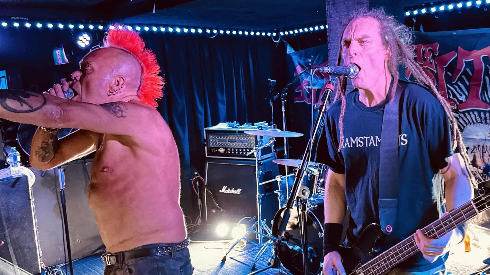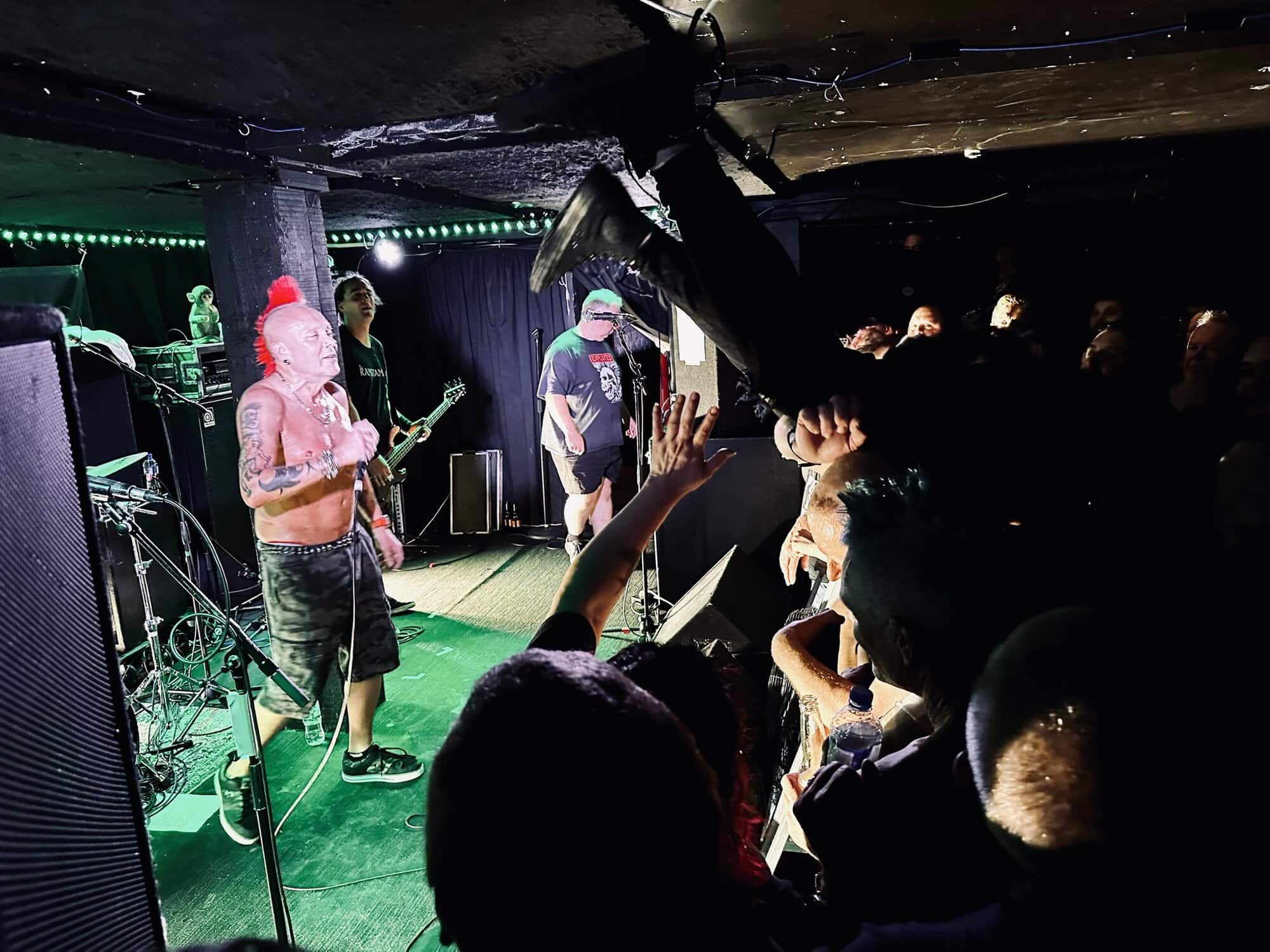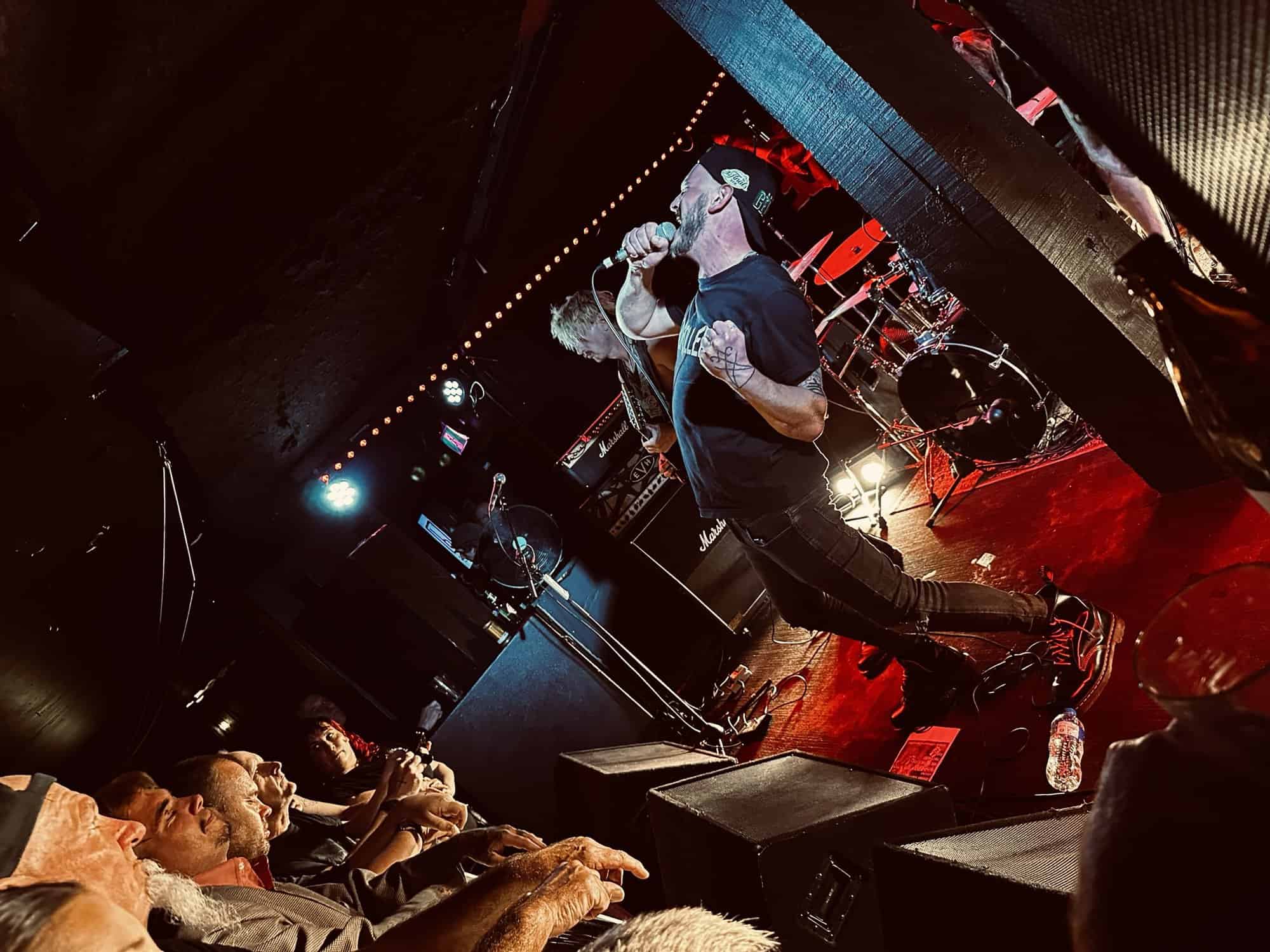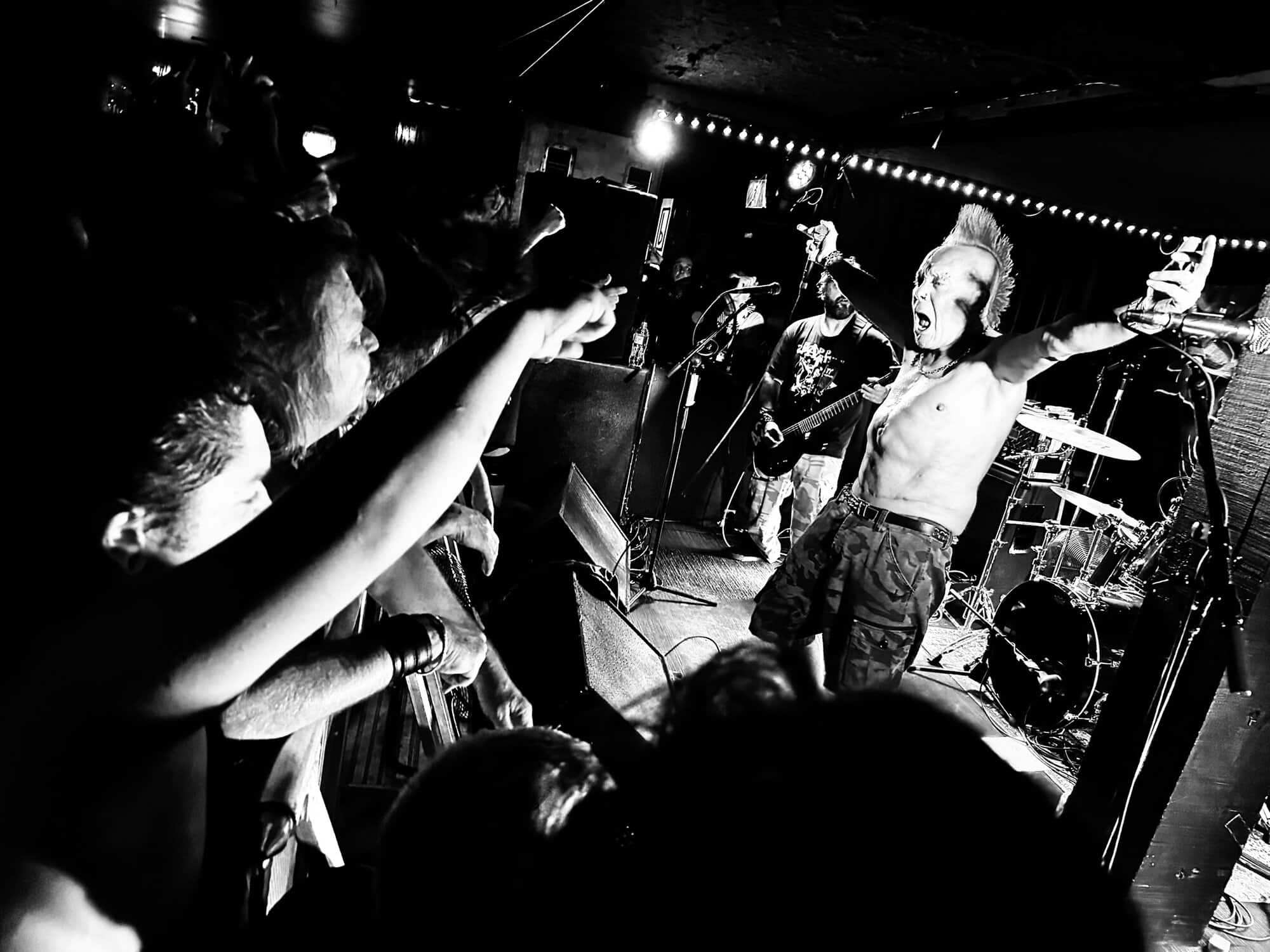 With little banter (a gruff ‘Alright’), The Exploited launched into Let’s Start a War, and the moshing in the Whammy Bar began. Mention is made at the end of punching through the first three songs (which sound tight and well-delivered, since The Exploited have arrived in Tamaki Makaurau at the end of a dozen shows through AUS/NZ) that it’s been three years since guitarist Stevie’s first shows with the band, that 2020 NZ Tour being part of it. Dogs of War starts the crowd singing along, and Wattie shares the vocals duties with the brave upfront souls being crushed on the barrier.
