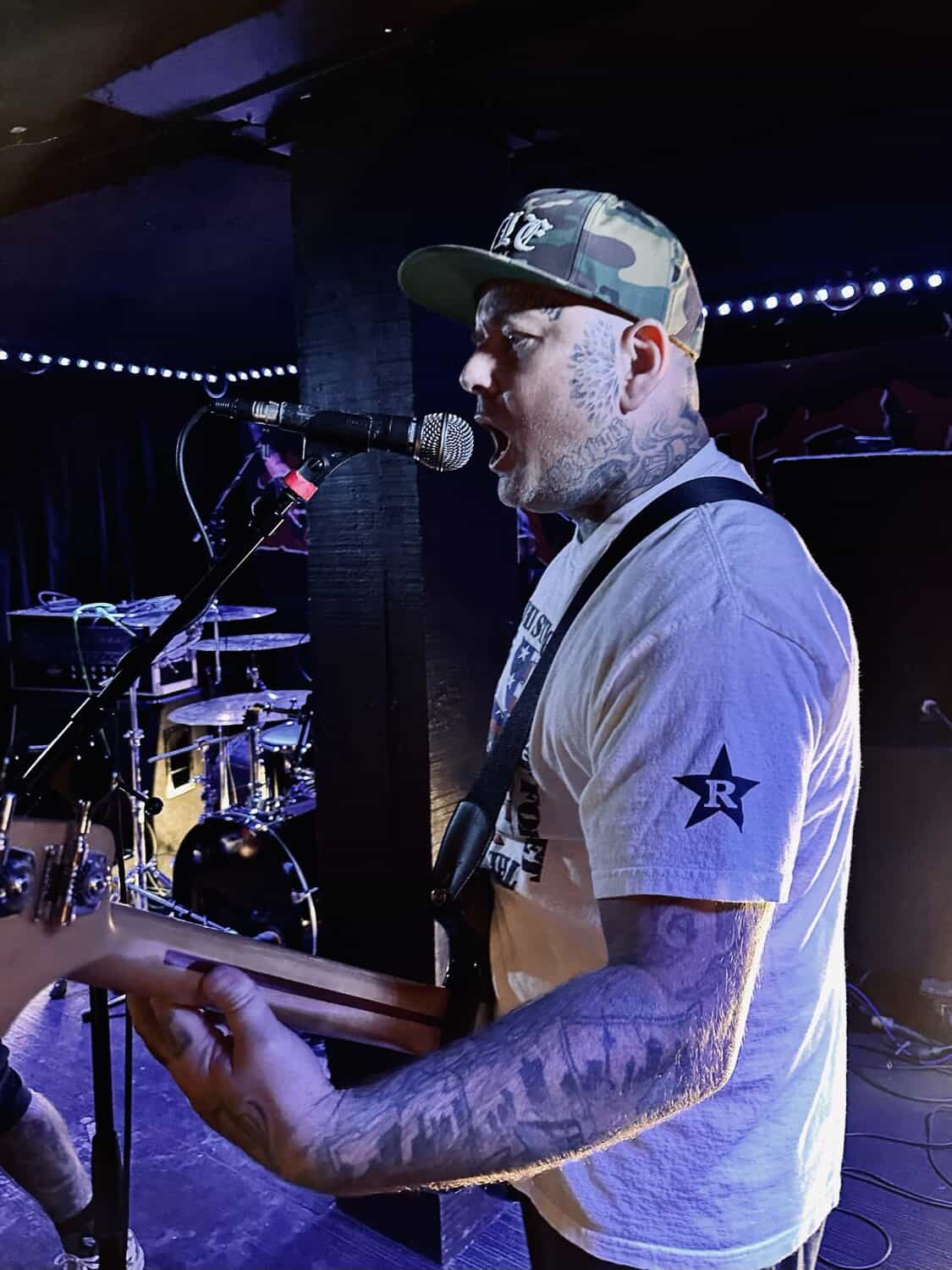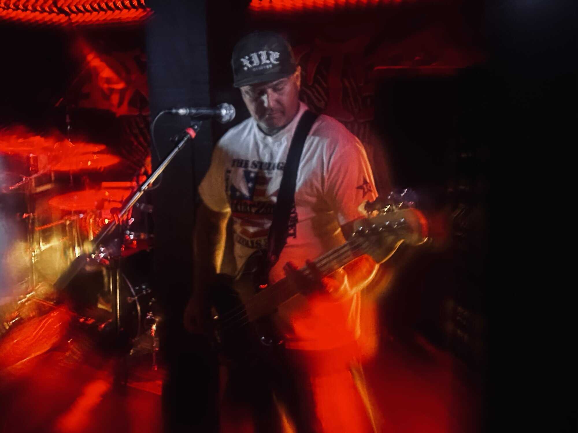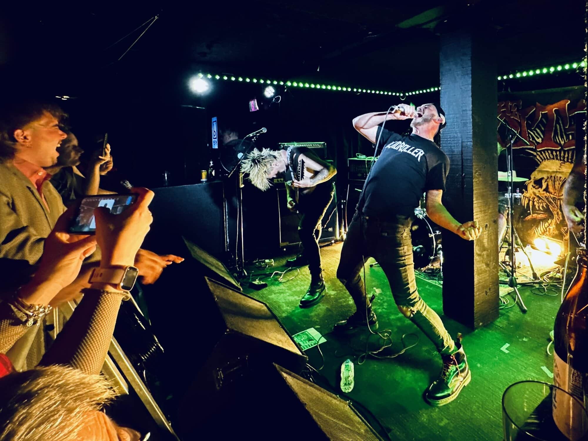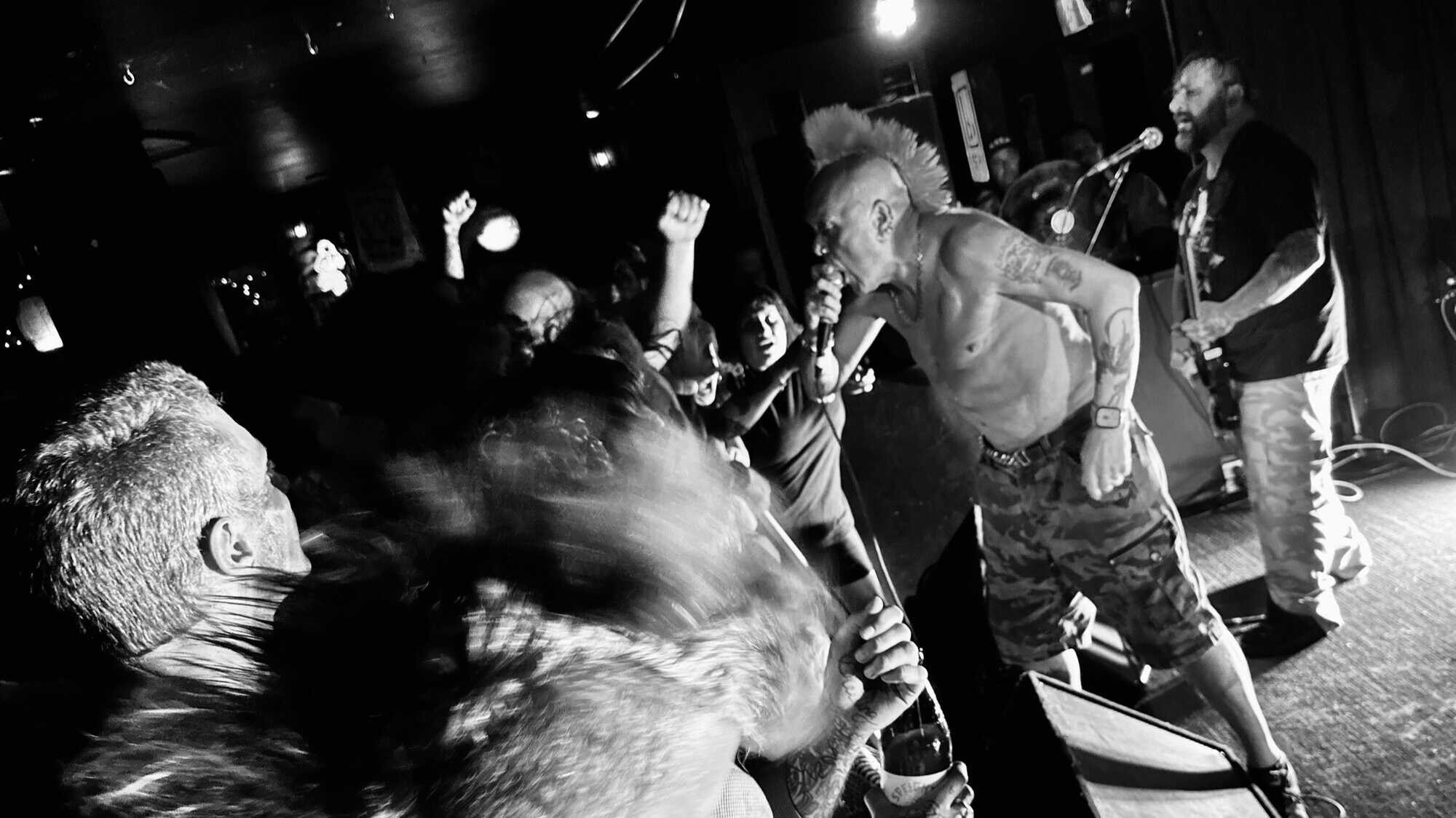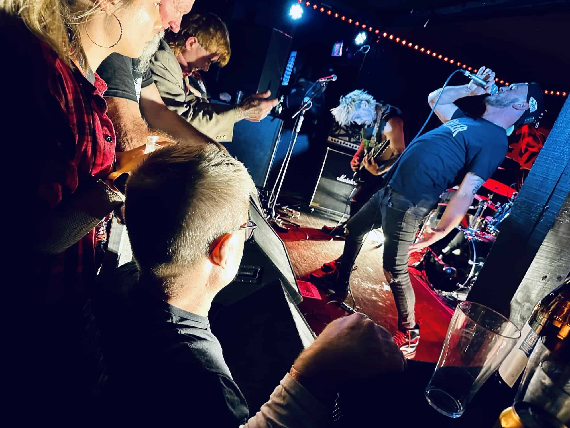 With little banter (a gruff ‘Alright’), The Exploited launched into Let’s Start a War, and the moshing in the Whammy Bar began. Mention is made at the end of punching through the first three songs (which sound tight and well-delivered, since The Exploited have arrived in Tamaki Makaurau at the end of a dozen shows through AUS/NZ) that it’s been three years since guitarist Stevie’s first shows with the band, that 2020 NZ Tour being part of it. Dogs of War starts the crowd singing along, and Wattie shares the vocals duties with the brave upfront souls being crushed on the barrier.