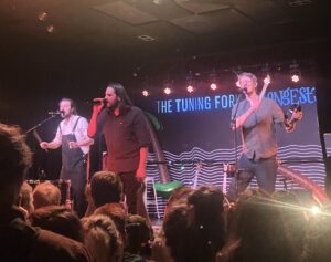 The question “Are you ready for a sea shanty?” evokes the night’s biggest cheer so far. It’s the traditional Santiana dating from the 1850s. Tales of Mexican armies and demise of a general.   Far away in time and place but tonight its three Englishmen in their 30s  dressed in black and  dungarees and an audience in love with new renditions of old songs. Clearly not missing flashy special effects; in love with a band who reverses convention and claps at their enthusiastic participation. I turn to Waiheke duo, The Wellermen, who play in this tradition and are standing beside me. Their smiles are wide.
