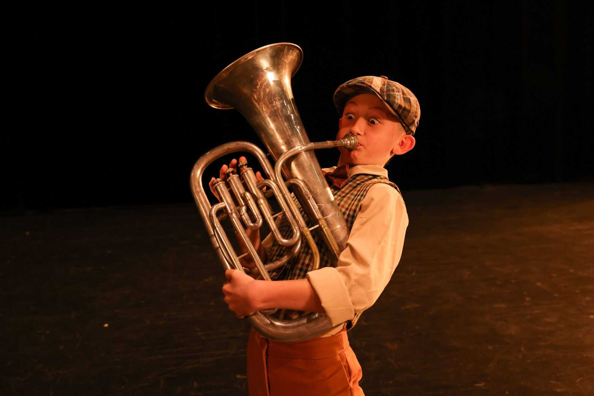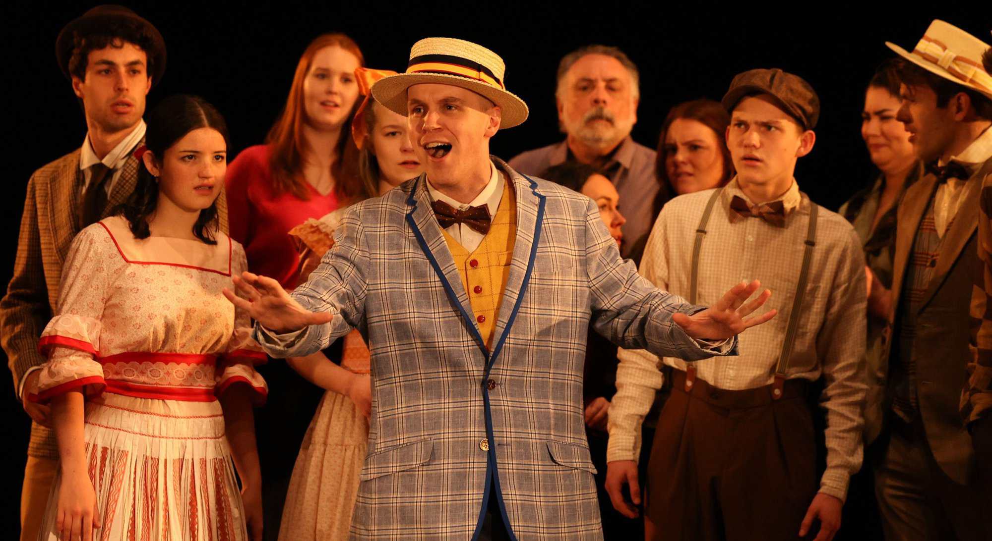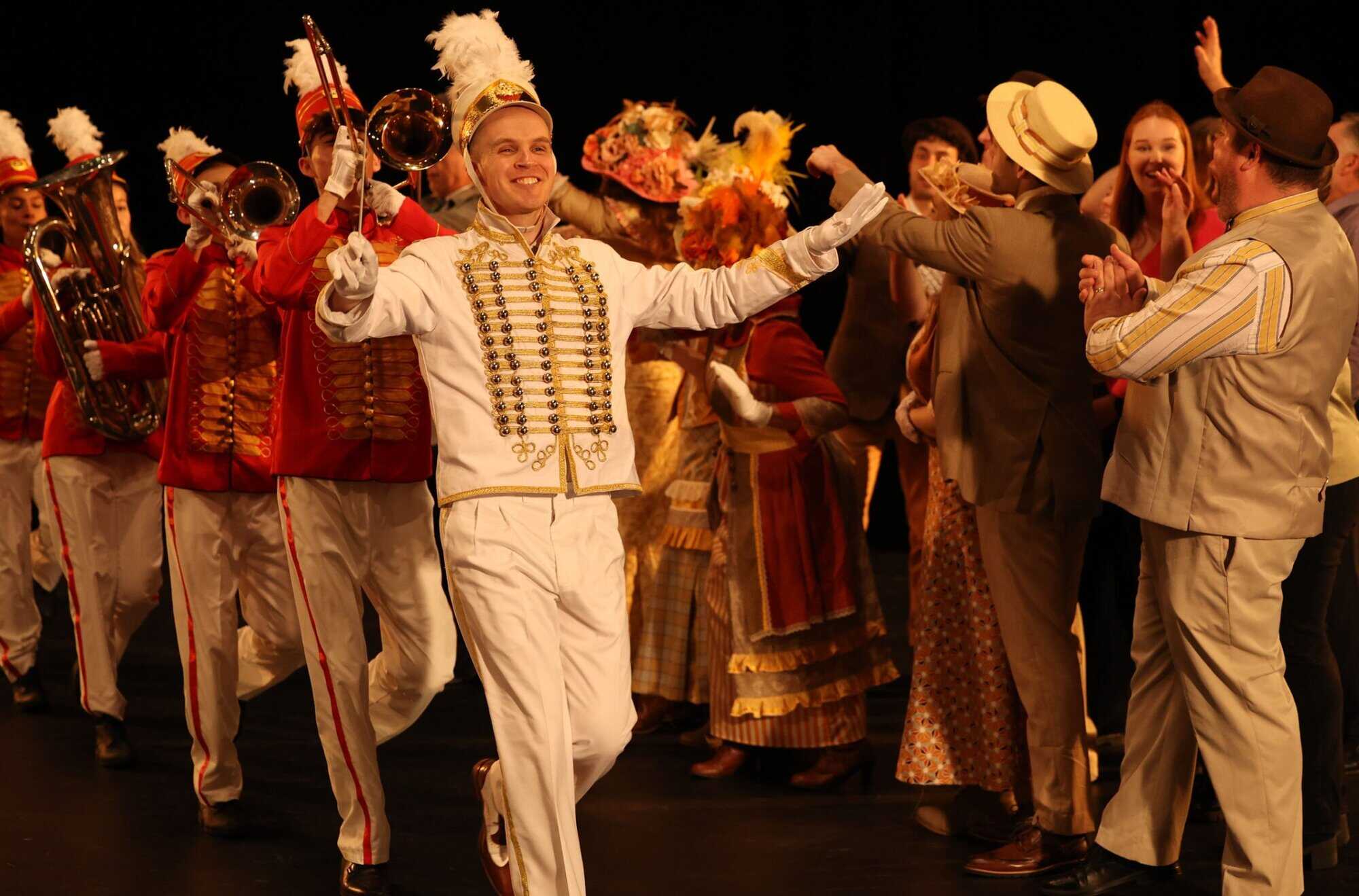 The story follows con man “Prof” Harold Hill (Kyle) as he attempts the dupe the folks who live in the small town of River City, Iowa. Hill cons the townspeople into believing he will form a boys’ marching band despite the fact that he has no musical abilities and only wants to run off with money given for uniforms and instruments.