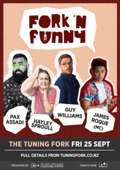 The Tuning Fork will be paying careful attention to public health and safety advice on social gatherings and will be working to create a safe and comfortable environment for all attendees. Any restrictions on gathering sizes will be adhered to carefully, but as a seated show Fork n Funny will endeavour to run under Level 1 or Level 2 restrictions. Visit The Tuning Fork website for up to date information on shows.