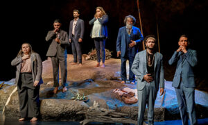 So, what we see is a re-enactment of the arrival of the First Fleet from the less known and documented perspective of the indigenous people of Australia whose land will be subsequently colonised. What ensues among the assembled elders is a kind of Counsel of War on the question of ‘visitor acceptance,’ with most initially vehemently opposed to the idea. But not all…….