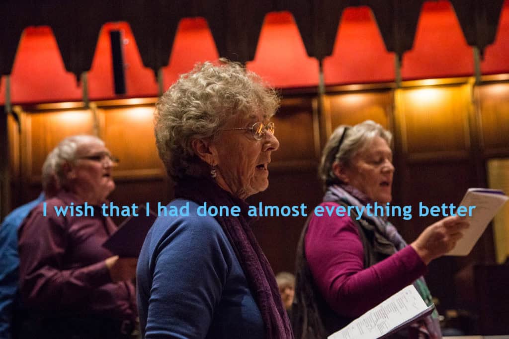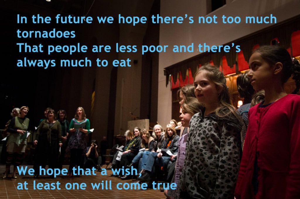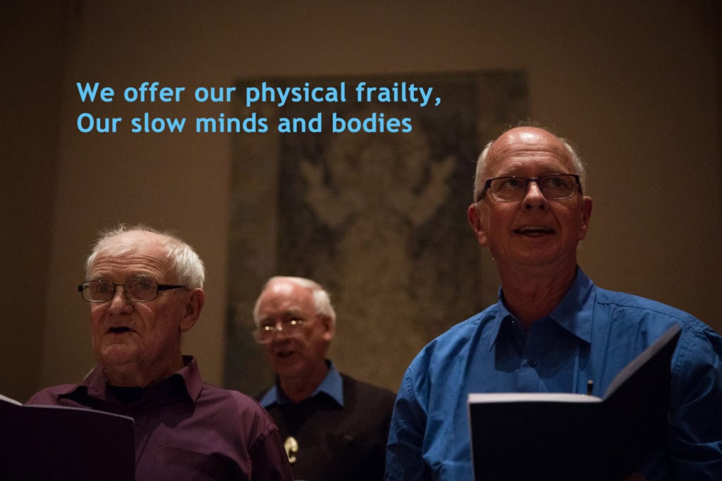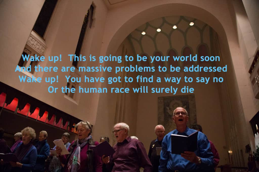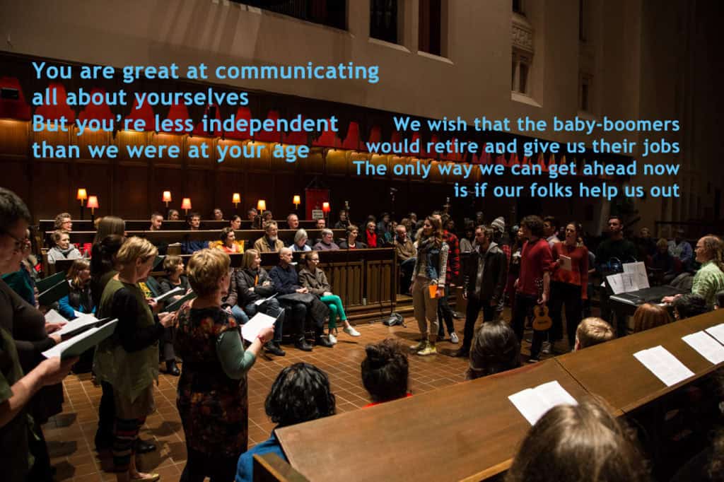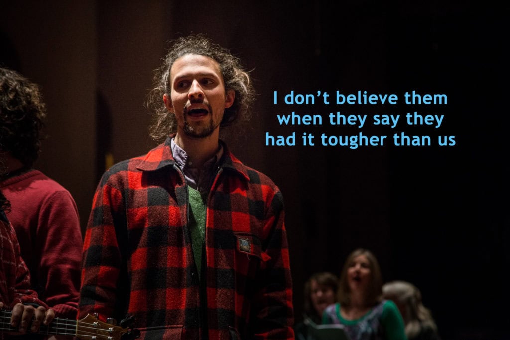 The text of the performance is as diverse as the performers, touching on technology, education, relationships, narcissism, social media, modern history, greed, climate change, war, peace, drugs, compassion, cruelty, and almost the entire spectrum of human existence. We see the 30-60s group champion their efforts toward creating peace, justice, kindness, and great music. They examine the result of their efforts – world-changing inventions that brought unmanageable pollution, a world stripped bare of resources, a cynical and disconnected society happily numbed through trash entertainment.