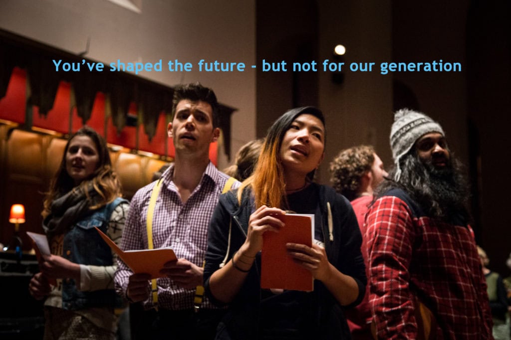 This moment is interrupted by the first of the Under 30s – late teens to young adults – who playfully tell both groups their generation ‘is pretty lit really’ and wish ‘the baby boomers would retire, and give us their jobs’. They share their desire to live, despite the difficulties presented by mindless, soul-destroying minimum-wage jobs and an acceptance that, before 30, they realise they may work until the day they die. They denounce racism, sexism, homophobia – they reveal their crippling anxieties, their desire for diversity and a loving world.