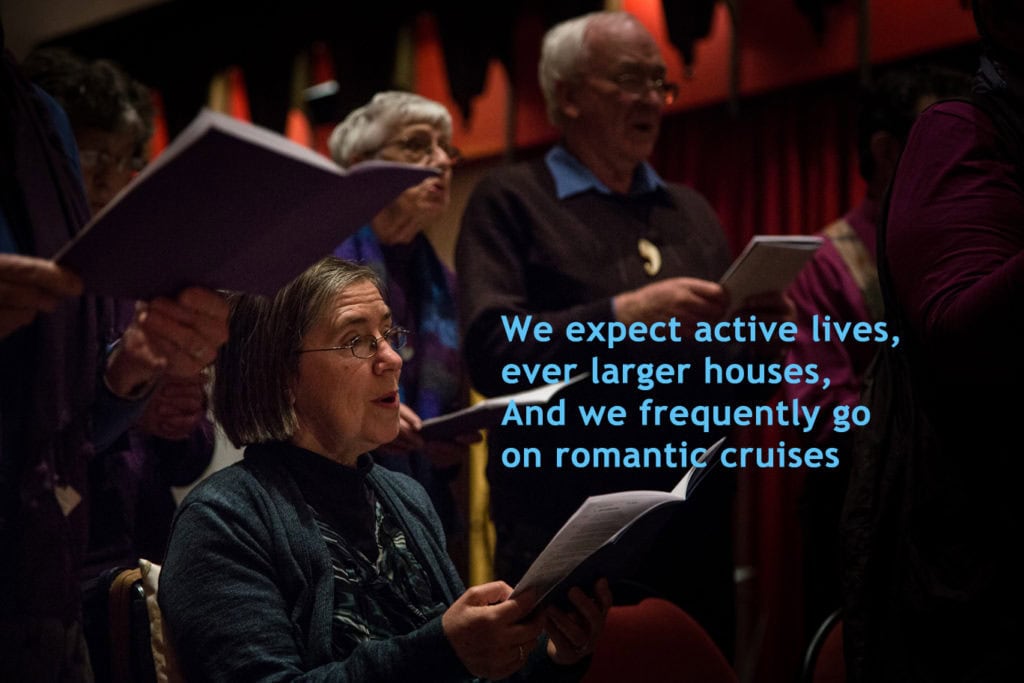We see the Over 60s expressing concern for this younger group; overworked, preoccupied, always taking on too much, doing too much, shouldering the responsibility for all the world’s failings and shortcomings, struggling, struggling, struggling to make a life worthy of living. They impart wisdom; to see everyone not as a challenge but as a source of support, to recognise themselves as the role models they are for an even-younger generation, to enjoy the moment, be free of regrets, and to dance – always, to dance and feel free.