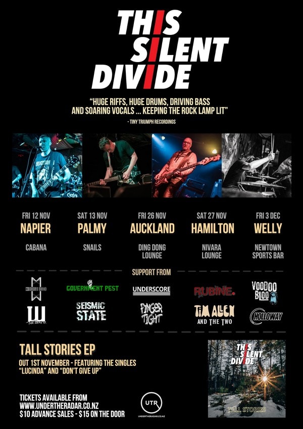 ‘Tall Stories’ featuring the singles ‘Lucinda’ and ‘Don’t Give Up’ was released on 1 November and will be supported by a 5-date North Island Tour. This Silent Divide are: Shaun Jones (vocals, guitar), Kieran Williams (lead guitar, backing vocals), Peter Stitt (bass, backing vocals), and Sunil Jolly (drums).