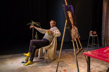 We are greeted by a painter’s studio on stage with the artist beavering away in front of a large canvas, prior to the start. He finishes it and turns it around to show us a visual illusion. A painting of the canvas and easel.