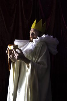 The King is a man-child. Spoilt and petulant, he can only stand and walk on the red carpet. Off this and he’s on the floor. Legs bend and wobble. It is a chaotic dance routine which incorporates Michael Jackson dance moves including a moon walk.