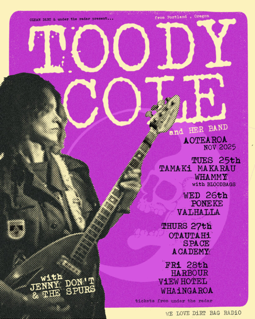 Dead Moon drummer Andrew Loomis once described the four string belter Toody Cole as “kicking ass and taking names” : Lemmy cited her as one of his favourite bass players. It’s now 33 years since she first visited Aotearoa with Dead Moon , the Portland band who famously turned down a Nirvana tour to honour a prior commitment to tour the motu.