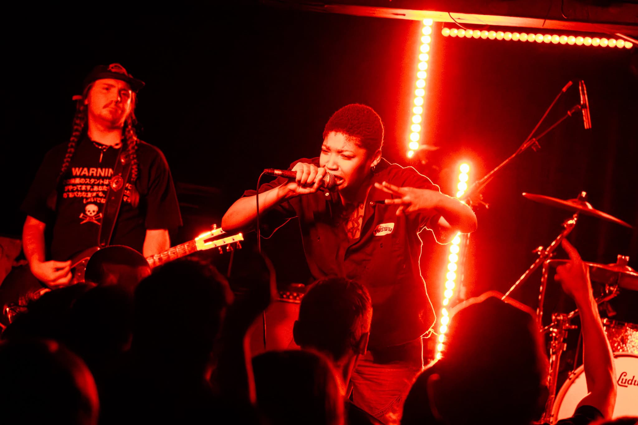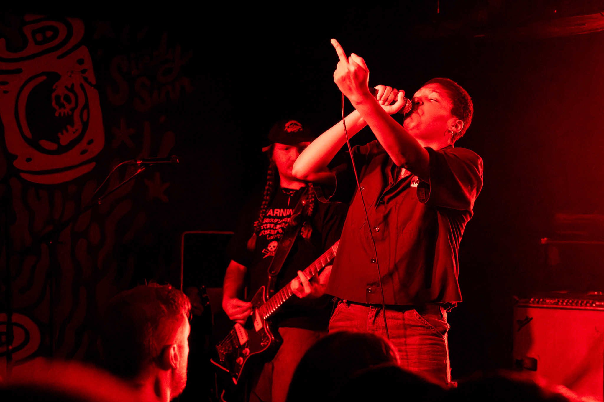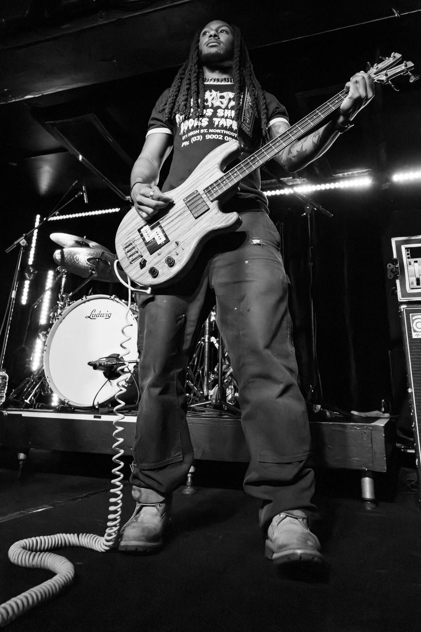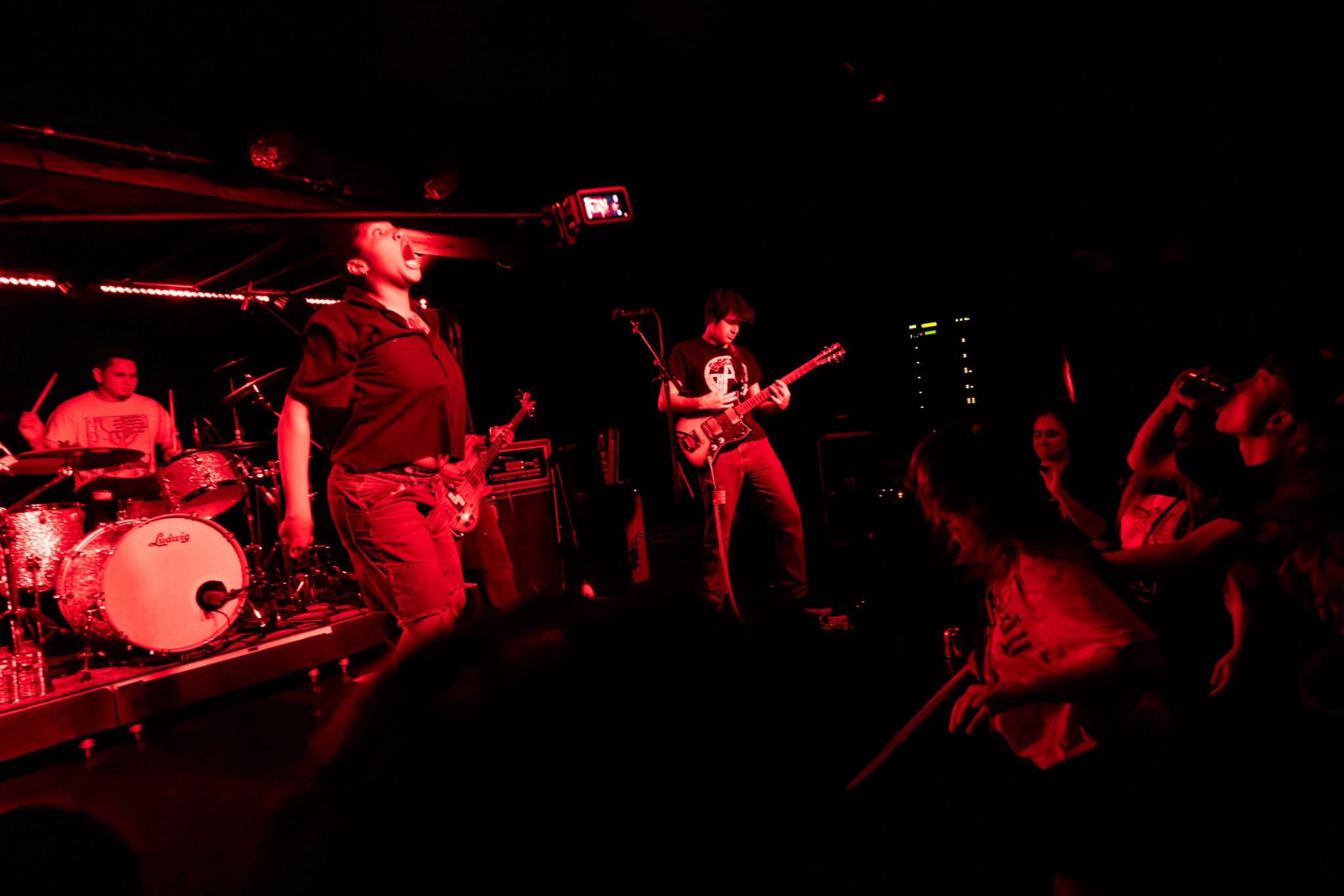 Mid-set, Salado and Mikey swap tools, as KT retires off stage, and we get a look in on another side of the band, as Salado also joins the manic crowd on the dance floor, though raised by the people, his boots never touch the ground. They deliver punk with more dirge, more dirtier, a little darker.