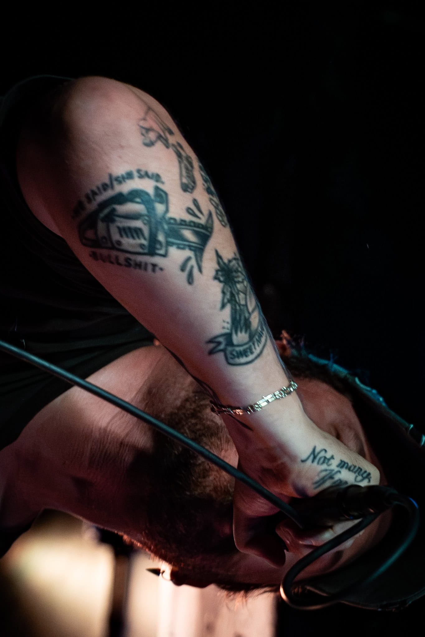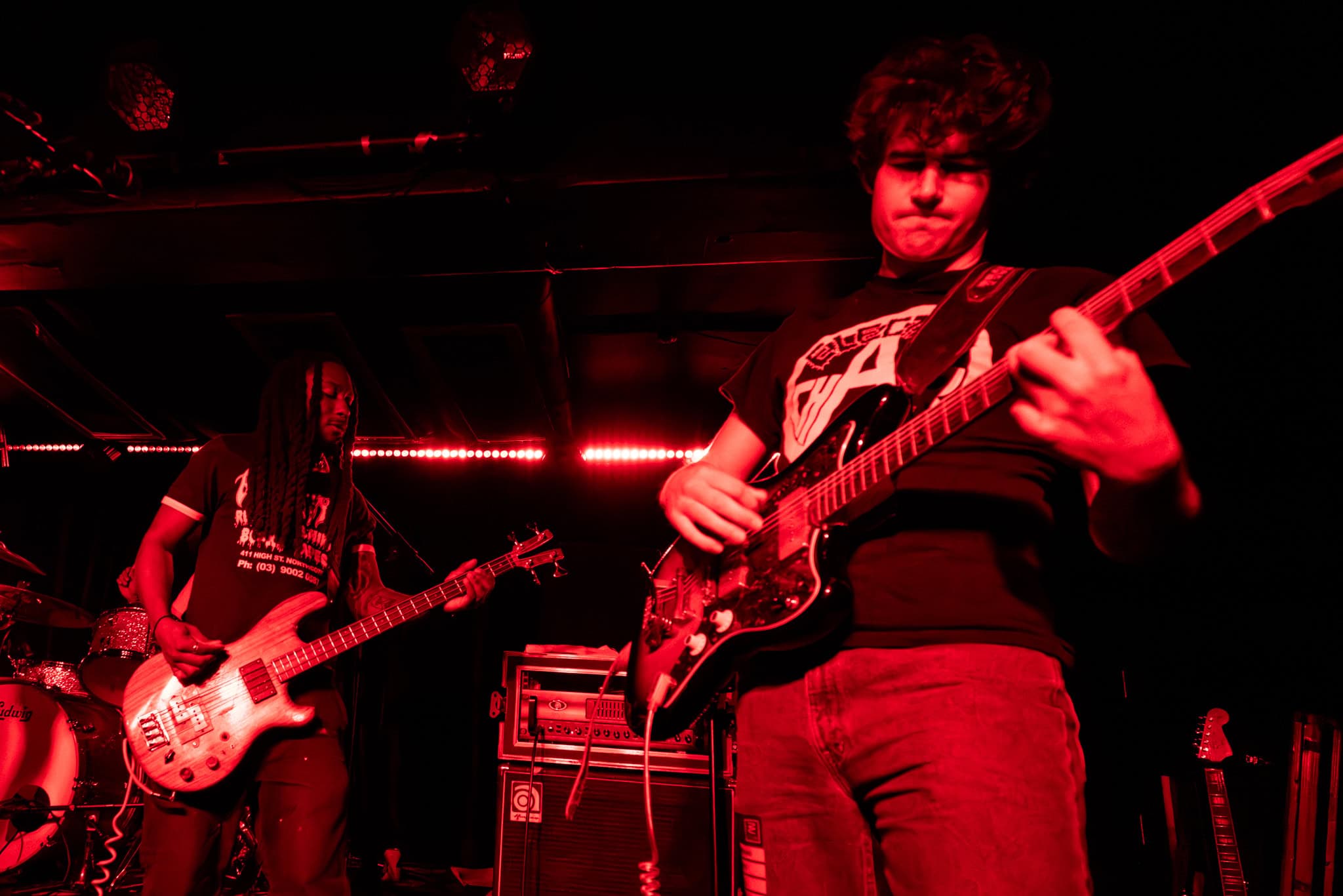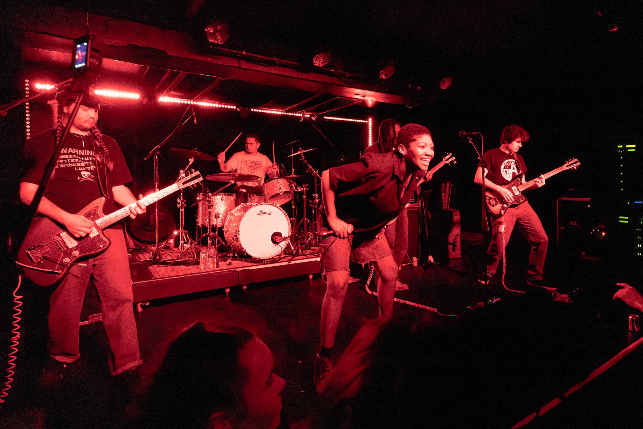 Mid-set, Salado and Mikey swap tools, as KT retires off stage, and we get a look in on another side of the band, as Salado also joins the manic crowd on the dance floor, though raised by the people, his boots never touch the ground. They deliver punk with more dirge, more dirtier, a little darker.