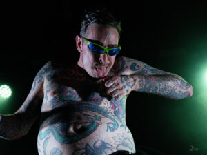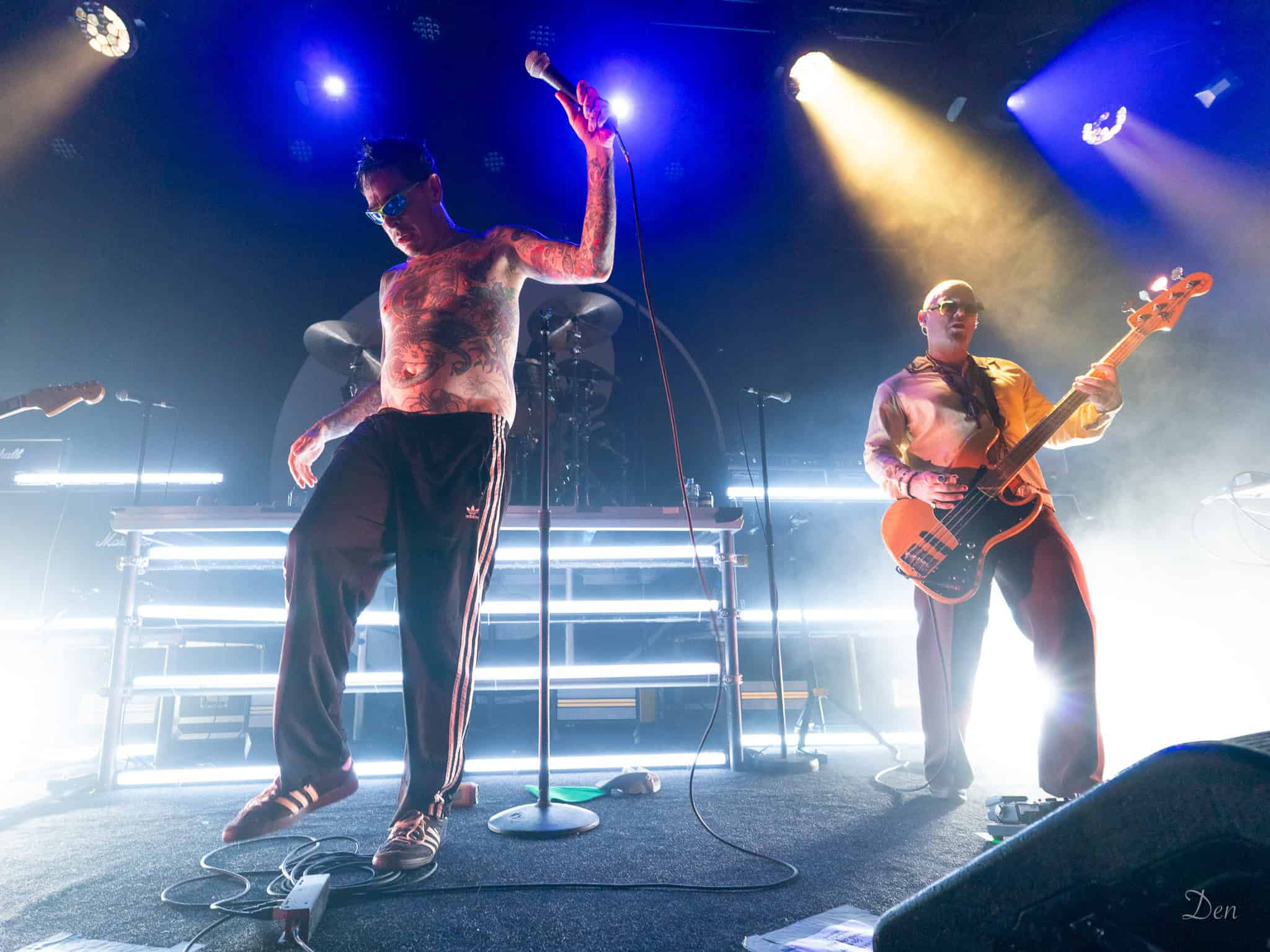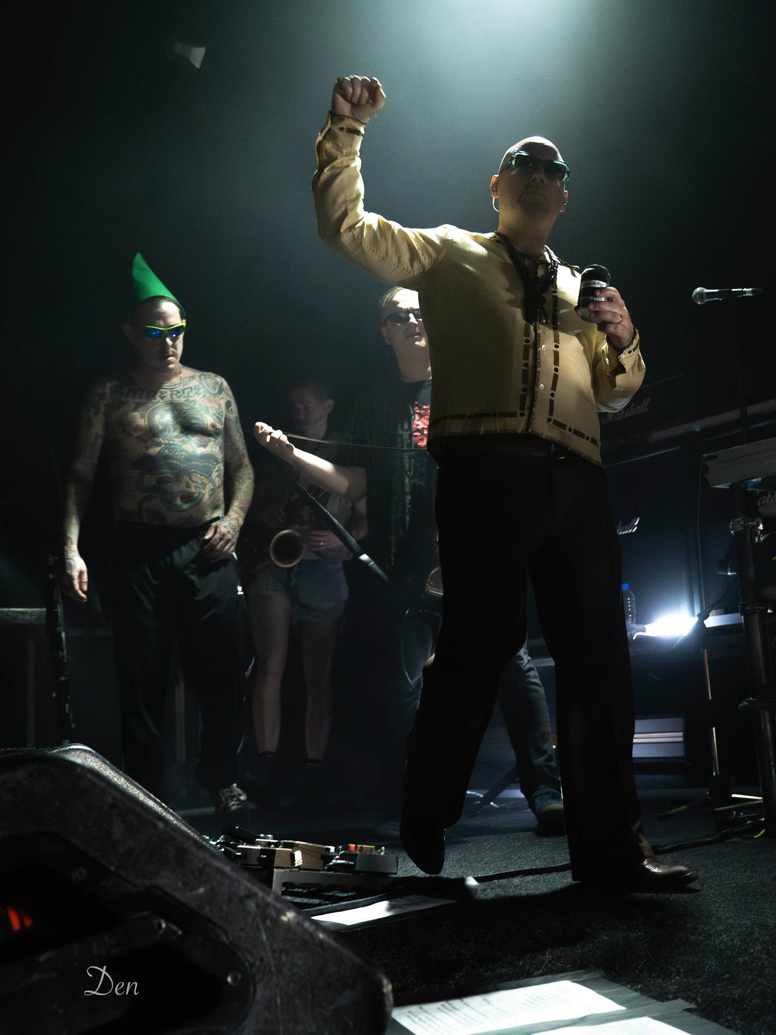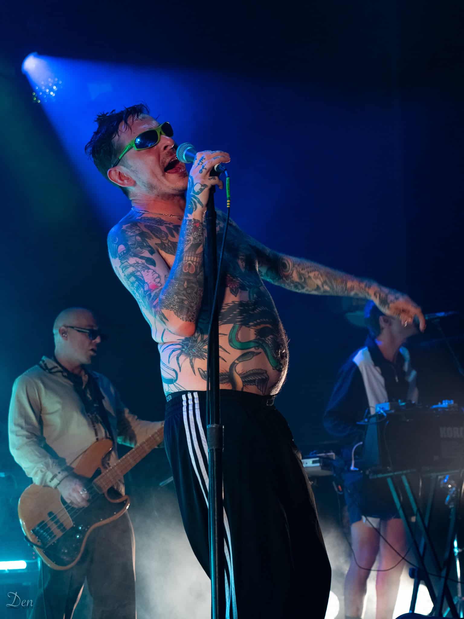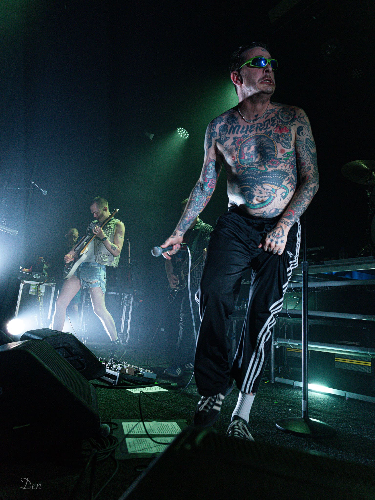 Pyramid of Health is followed by Murphy sharing his worldview (one that his band members seem to endorse) Fans of Viagra Boys will know the band cut no slack to adherents of authoritarianism and bigotry, as Murphy and mates call/chant for a free, Gaza, Ukraine, Iran and liberation of a third-world America. It’s received well. Murphy, politely, suggests dissenters quietly exit the room. Troglodyte (from 2022 Cave World) follows, perhaps reinforcing the group’s stance, with its wawa guitar intro and quirky beat, it is being driven by Elias Jungqvist as he manipulates his keyboards (and bongos), escalating and adding electronic richness, keeping the crowd enraptured. Murphy forever the prankster threatens to sing only sad songs for the rest of the night, an improv, adlib song with Jungqvist joining in, amused, with its narrative of hooking up, performance issues, and a morning dinner date. He truly loves to fuck with people.