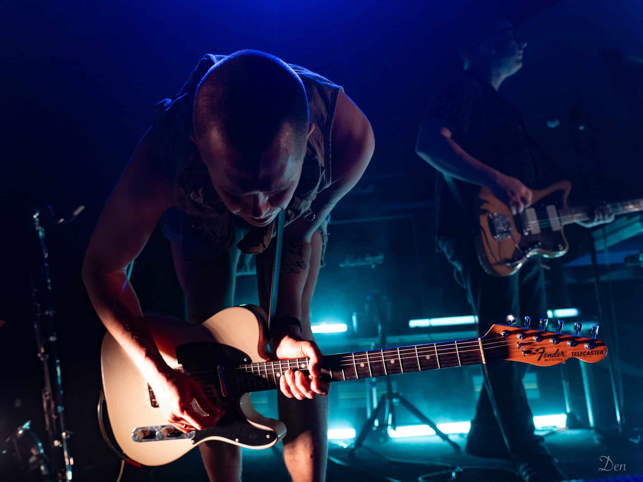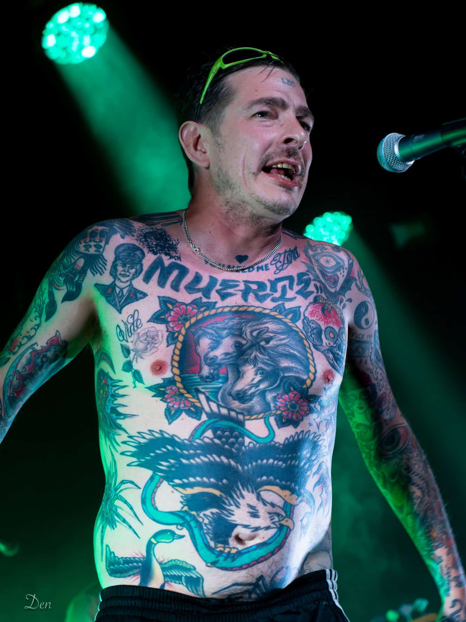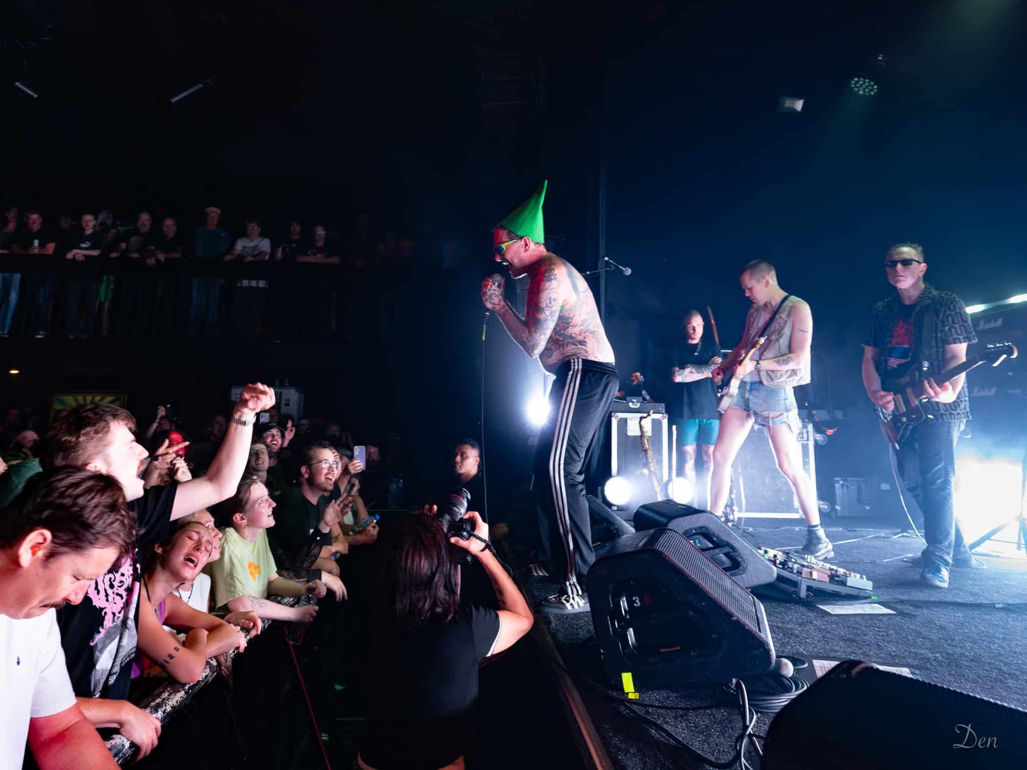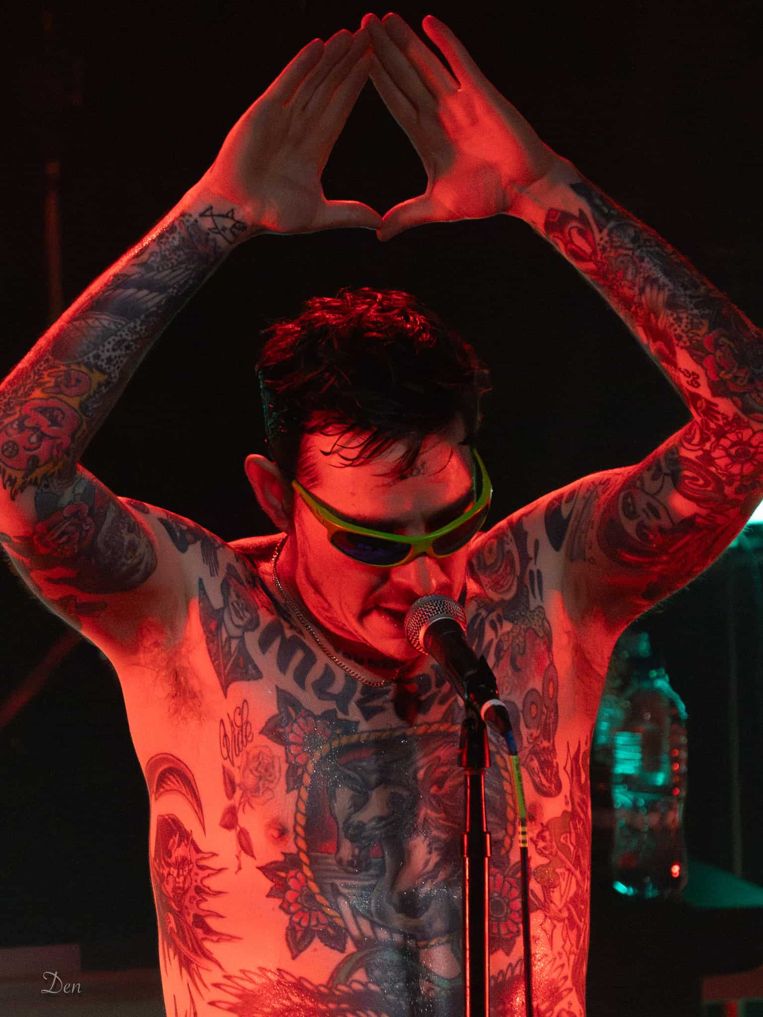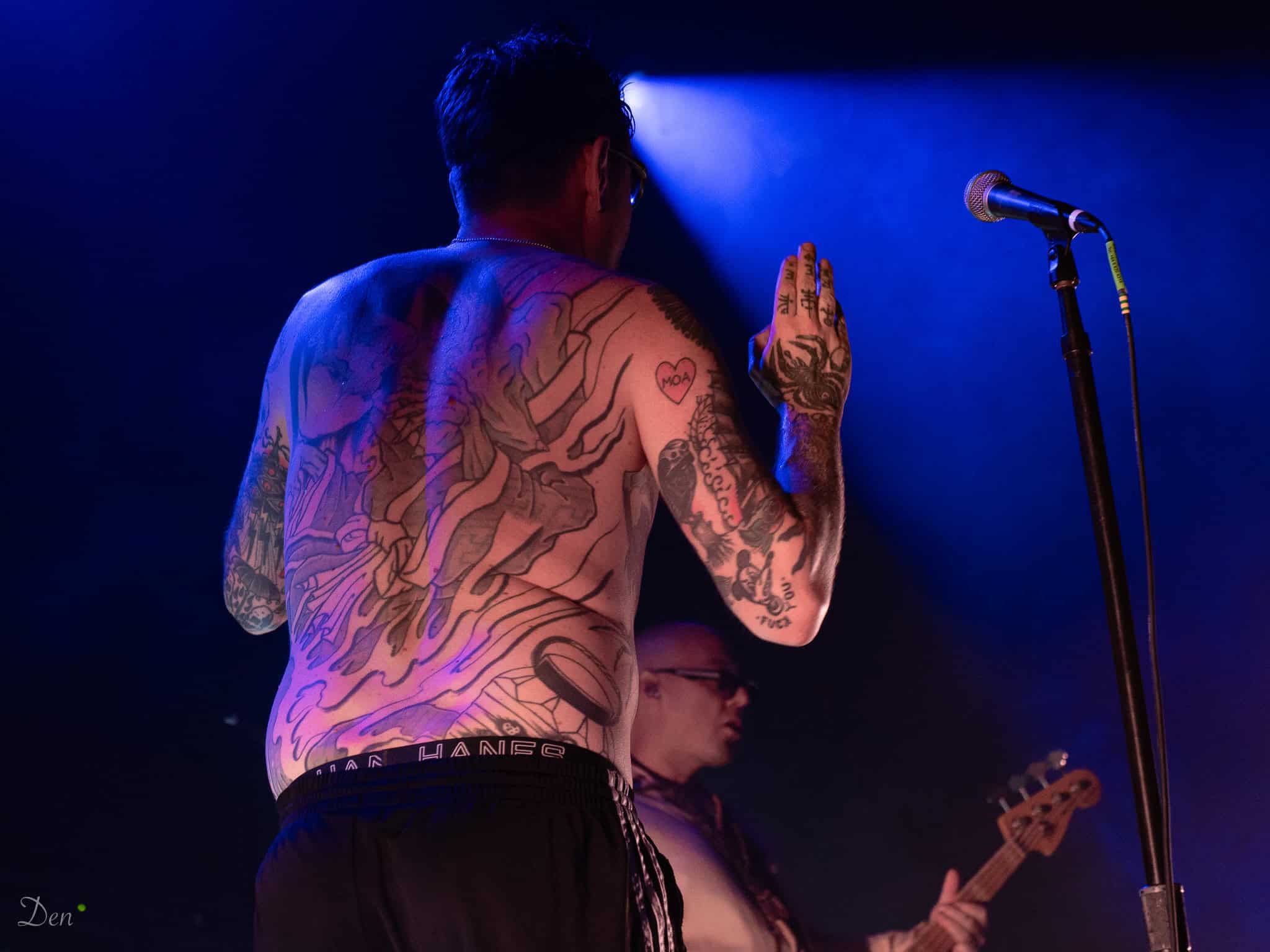 Cone on head (like the figure off the cover off viagr aboys) frontman Sebastian Murphy takes the lead, as the band kick off with Man Made of Meat, and the crammed masses in the Powerstation erupted in joy. Murphy, is topless, in trackies, festooned in tattoos, beer bodied, and already doing a little dance. They juxtapose immediately; immediately launching into Slow Learner from their debut album, 2018’s Street Worms. The night has been set up, the musical narrative in play.