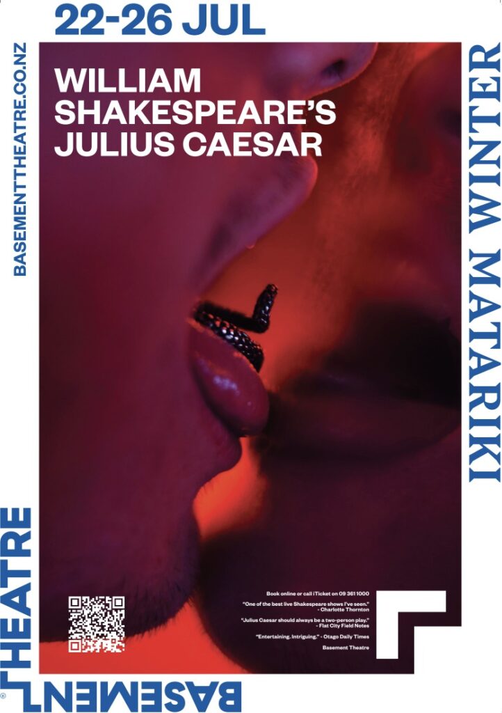 William Shakespeare’s Julius Caesar sometimes seems like it has a cast of thousands. Last time we saw it in Auckland it had at least twenty. Last night, at the Basement Theatre with two actors and one effective sound and lighting manager, it had a cast of two. It was remarkable.
