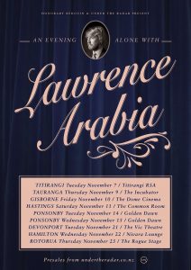 So come along North Islanders and join me, Lawrence Arabia, New Zealand’s pre-eminent chronicler of 21st Century bourgeois dilemmas, for a “communal experience of joy so rare in this decadent age of digital insularity.”